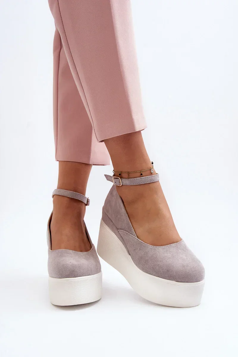 Dámské espadrilky postavené na platformě s klínkem. Vyrobeno z ekologického semiše. Zakryté, zaoblené prsty. Zapínání pomocí nastavitelného popruhu s přezkou. Tento model má měkkou vložku z ekokůže, která zajišťuje pohodlí při používání. Ideální pro jarní a letní styling! Při výběru velikosti se řiďte tabulkou velikostí.