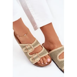 Zelené dámské háčkované pantofle Fenira se zlatými přezkami kombinují pohodlí, lehkost a elegantní vzhled. Prodyšný háčkovaný materiál zajišťuje příjemný pocit při nošení, zatímco zlaté přezky dodávají obuvi sofistikovaný a stylový detail. Ideální volba pro letní volnočasové outfity a domácí nošení.
