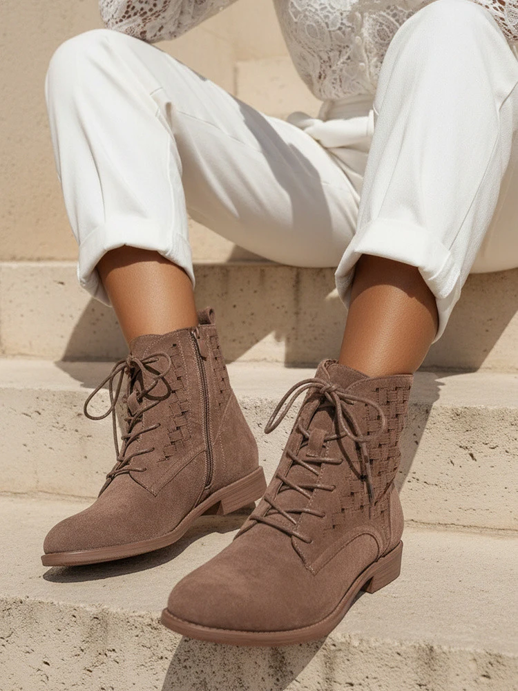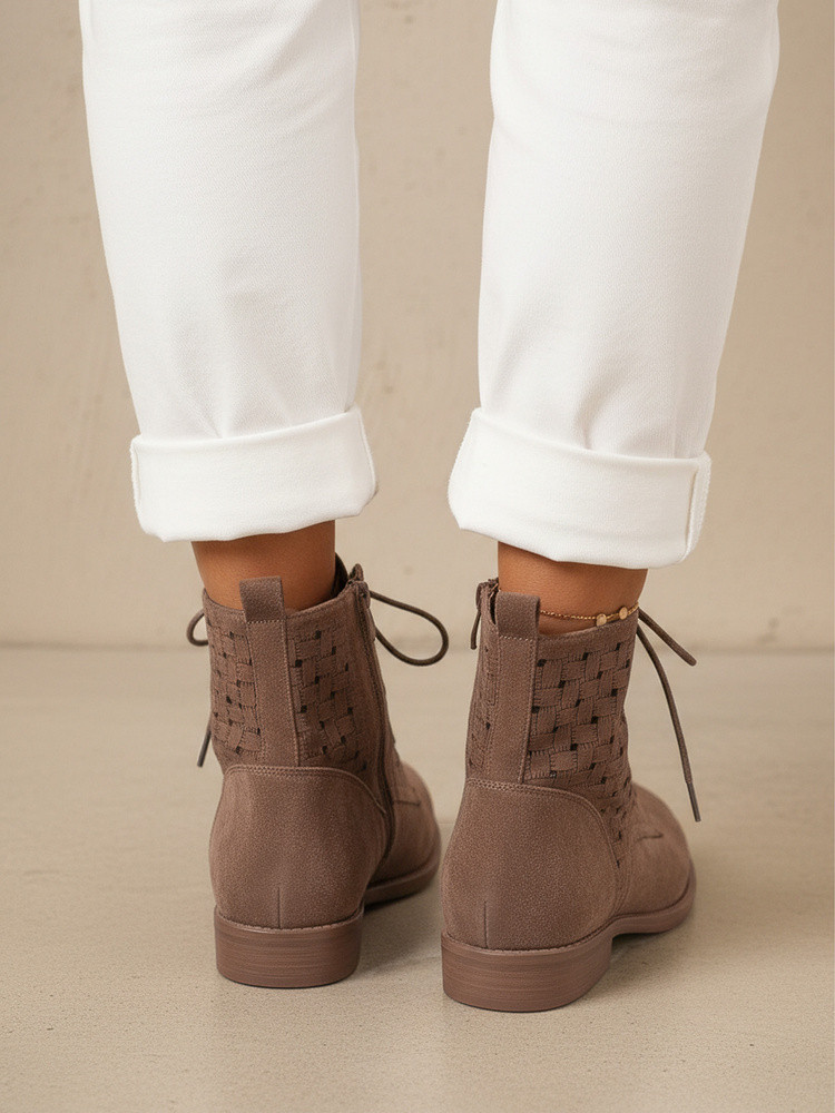Kozačky vyrobené z ekologického semiše s tkanou perforovanou strukturou jsou navrženy tak, aby podporovaly prodyšnost a lehké používání v přechodném období. Nízký podpatek podporuje stabilitu při každodenní chůzi. Kombinace šněrování a zipu umožňuje přesné uchycení kolem kotníku.