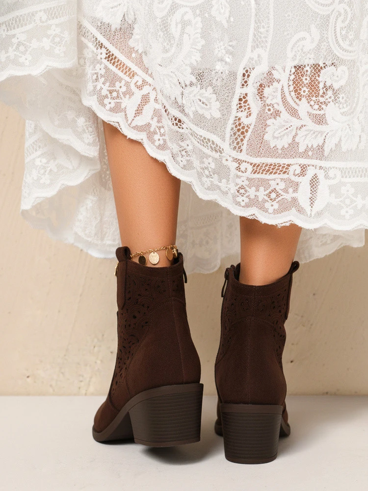 Boty z ekokůže s ozdobným ažurovým svrškem. Stabilní podpatek podporuje pohodlnou chůzi a jemně zvýrazňuje siluetu. Lehká konstrukce se dobře osvědčí v přechodném období. Zapínání na zip usnadňuje rychlé nazouvání a vyzouvání.