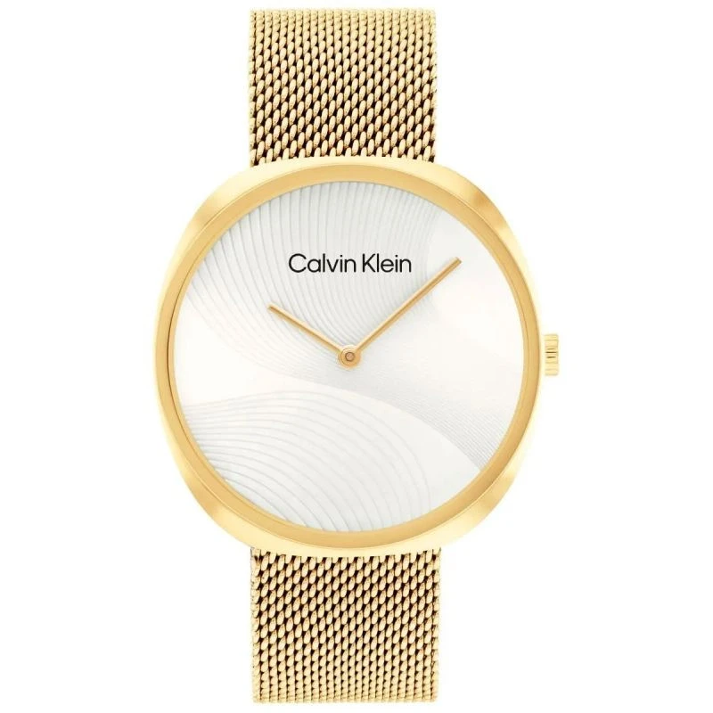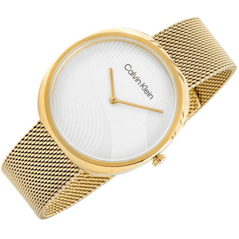 Delikatne wskazówki i tarcza, która miękko odbija światło – wszystko razem tworzy kompozycję, od której trudno oderwać wzrok. Wysokiej jakości materiały, dopracowane z zegarmistrzowską precyzją detale i perfekcyjnie skomponowana kolorystyka – zegarek Calvin Klein nosi się jak biżuterię, a każdy rzut oka na nadgarstek staje się estetycznym przeżyciem. Całość dopełniają: logo na tarczy, zapięciu bransolety oraz CK na koronce zegarka.