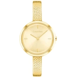 Hodinky CALVIN KLEIN Iconic jsou esencí minimalistické elegance, která dokonale zapadá do estetiky moderní ženy. jejich design vyniká subtilním ciferníkem se zářivým slunečním paprskem broušeným do zlatých tónů, který krásně odráží světlo a dodává hodinkám vznešený charakter. výrazným prvkem modelu je polotuhý náramek s jemně zaobleným, oválným profilem. Díky svému provedení dokonale sedí na zápěstí a vytváří s ním téměř jednotu - jako elegantní šperková obruč. jeho reliéfní, texturovaný povrch, zdobený opakujícím se logem "ck Calvin Klein", je módním akcentem, který náramku dodává moderní, designový charakter a dává hodinkám vyniknout oproti klasickým modelům.