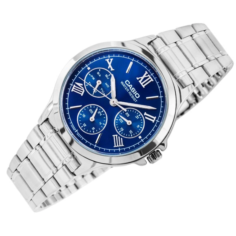 Tyto hodinky CASIO jsou skutečným skvostem mezi dámskými doplňky - fascinují svým hlubokým kobaltovým ciferníkem, který se v závislosti na světle třpytí jako hladina jezera za soumraku. Jemné římské indexy a štíhlé ručičky dodávají hodinkám noblesu, zatímco lesklý stříbrný náramek decentně zvýrazňuje ženské zápěstí. Tři malé ciferníky se starají o každodenní organizaci - ukazují den v týdnu, datum a 24hodinový čas. Kombinace elegance, funkčnosti a smyslného šarmu, vytvořená pro ženy, které milují detaily s charakterem.