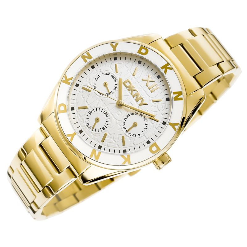 Světlý povrch ciferníku hodinek zdobí decentní reliéfní vzor s opakujícím se logem DKNY, který dodává jedinečný šperkařský nádech. zlaté ručičky a indexy hodin dodávají luxusní vzhled, zatímco elegantní římská číslice XII podtrhuje klasický akcent. tři dílčí ciferníky zajišťují funkčnost a dokonalé detaily - ukazatel dne v týdnu, datumovka a 24hodinový režim usnadňují každodenní plánování. bílý rámeček s výrazným zlatým logem DKNY obepíná celé hodinky a dodává jim osobitou a moderní eleganci.