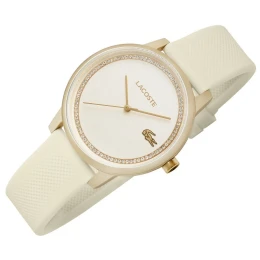 Złocona tarcza, lśniąca niczym ciepłe promienie zachodzącego słońca, dodaje zegarkowi blasku, który nie jest nachalny, ale doskonale wyważony – tak jak perfumy, które zostawiają za sobą delikatną woń luksusu. Cyrkonie, które otaczają tarczę, przypominają rozgwieżdżone niebo – ich subtelne migotanie sprawia, że każda sekunda jest pełna blasku, ale nigdy przesadnego. To wyrafinowany dodatek, który podkreśla klasę bez zbędnego przepychu.Pasek w ciepłym odcieniu kości słoniowej, wykonany z gładkiego, matowego materiału, jest jak delikatny aksamit na skórze – komfortowy, a jednocześnie pełen klasy. Idealnie balansuje pomiędzy klasycznym urokiem a nowoczesnym designem, dodając całości miękkości i subtelności, która kontrastuje z wyrazistą, złotą tarczą. Każdy szczegół, od subtelnie połyskującego napisu LACOSTE po złotego krokodyla na godzinie trzeciej, to niczym biżuteria dodana do codziennej stylizacji, która nie tylko zdobi, ale staje się integralną częścią osobistego stylu.