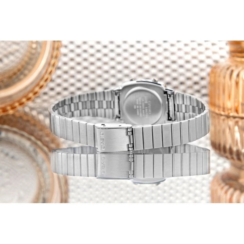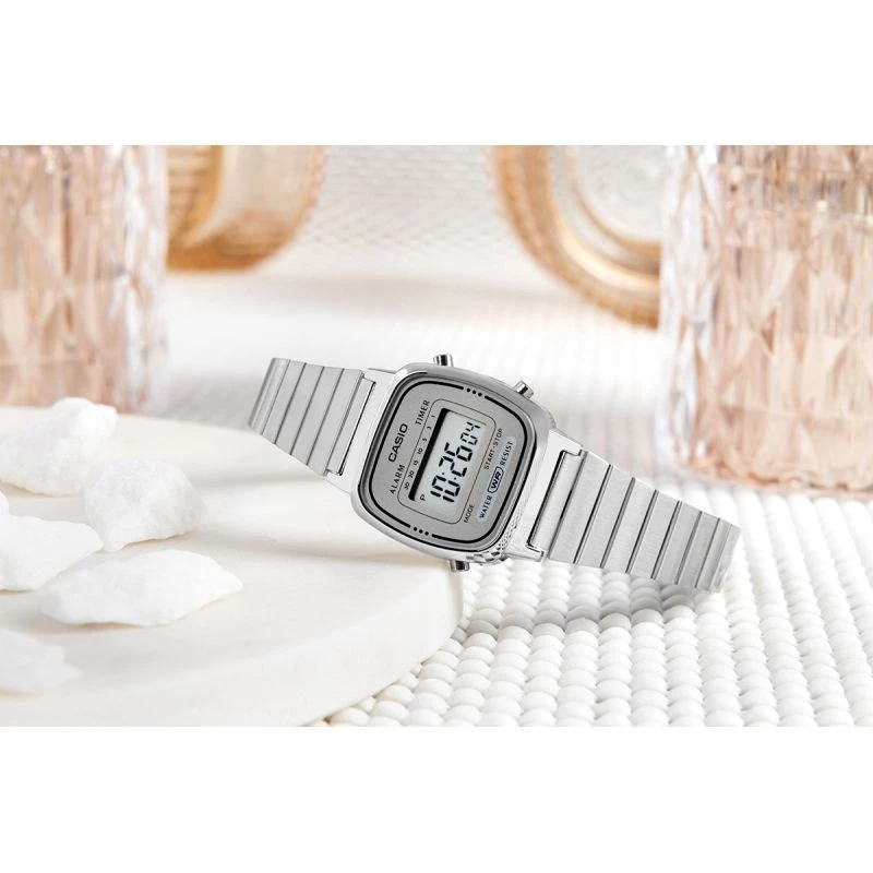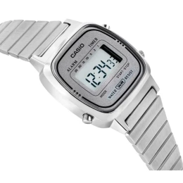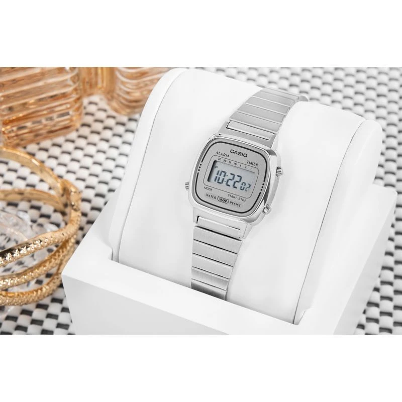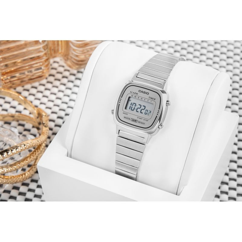Digitální model CASIO LA670WA-7DF je ideální volbou pro ženy, které milují módu, ale nehoní se za ní slepě - vybírají si to, co vyhovuje jejich vlastnímu rytmu a stylu. Štíhlá zaoblená obálka obklopená kovovým náramkem evokuje atmosféru 70. let a dodá každému vzhledu nádech retro šarmu a nonšalantní elegance.
