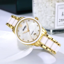 Zegarek damski Skmei 2175GD to elegancja, która pulsuje blaskiem i subtelnością. Jego złoto-biała bransoleta, wykonana z połączenia lśniącej stali i delikatnych, ceramicznych elementów, oplata nadgarstek niczym luksusowy klejnot, dodając szyku i wdzięku każdemu ruchowi.