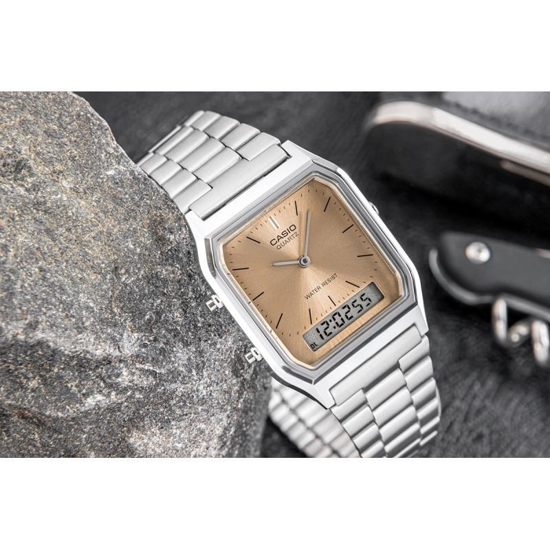 Uroczo klasyczny, modnie kolorowy - kultowy zegarek CASIO w odświeżonej palecie najnowszych trendów kolorystycznych! Retro prostota spotyka się tutaj z nowoczesną funkcjonalnością w zegarku analogowym z małym cyfrowym okienkiem, które zapewnia szybki dostęp do najważniejszych informacji. Zegarek umożliwia śledzenie dwóch stref czasowych, a funkcje takie jak stoper, alarm i automatyczny kalendarz sprawiają, że zegarek ten doskonale sprawdza się w rytmie współczesnego życia. Uniwersalny, elegancki design sprawia, że zegarek doskonale pasuje zarówno na formalne uroczystości, jak i na codzienne wyjścia.Idealny wybór dla tych, którzy cenią styl vintage, ale nie chcą rezygnować z nowoczesnych rozwiązań.