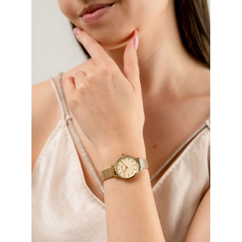Jemný náramek mesh dodává stylingu nádech jemnosti a smyslnosti. Je vyroben z vysoce kvalitní nerezové oceli a spojuje eleganci s odolností a pohodlím při nošení. Smyslnost tohoto zlatého náramku znamená, že dokonale sedí na ženském zápěstí, jemně ho obepíná a zdůrazňuje jeho ženskost. Tu doplňuje decentní logo na zapínání náramku, které mu dodává exkluzivní nádech.