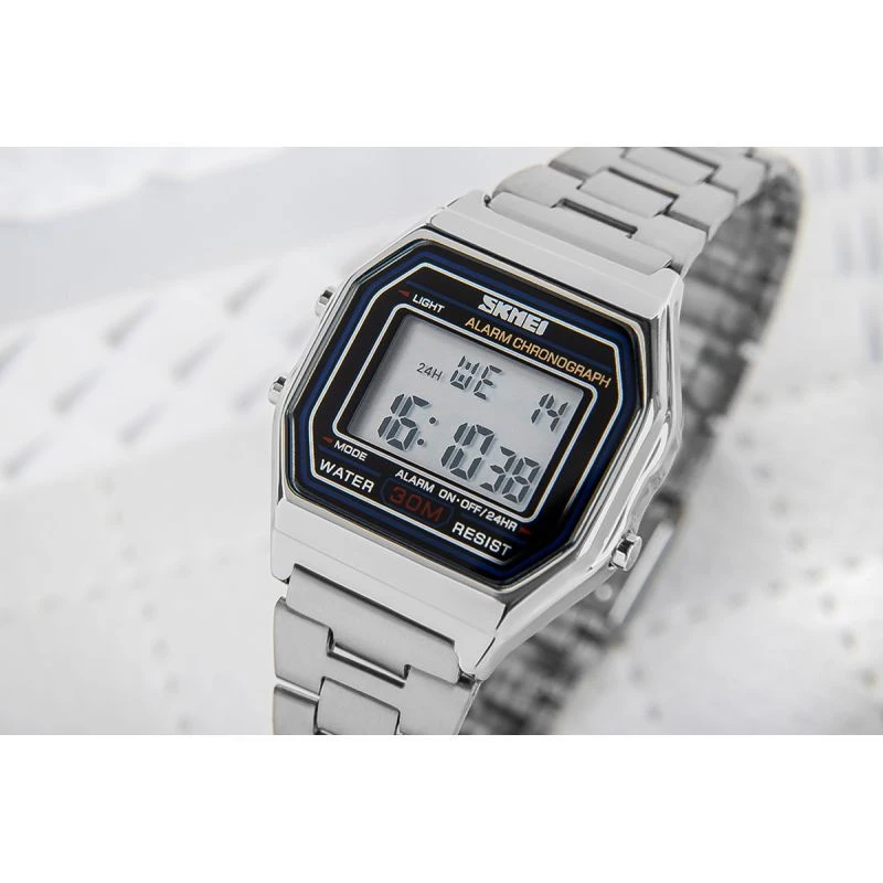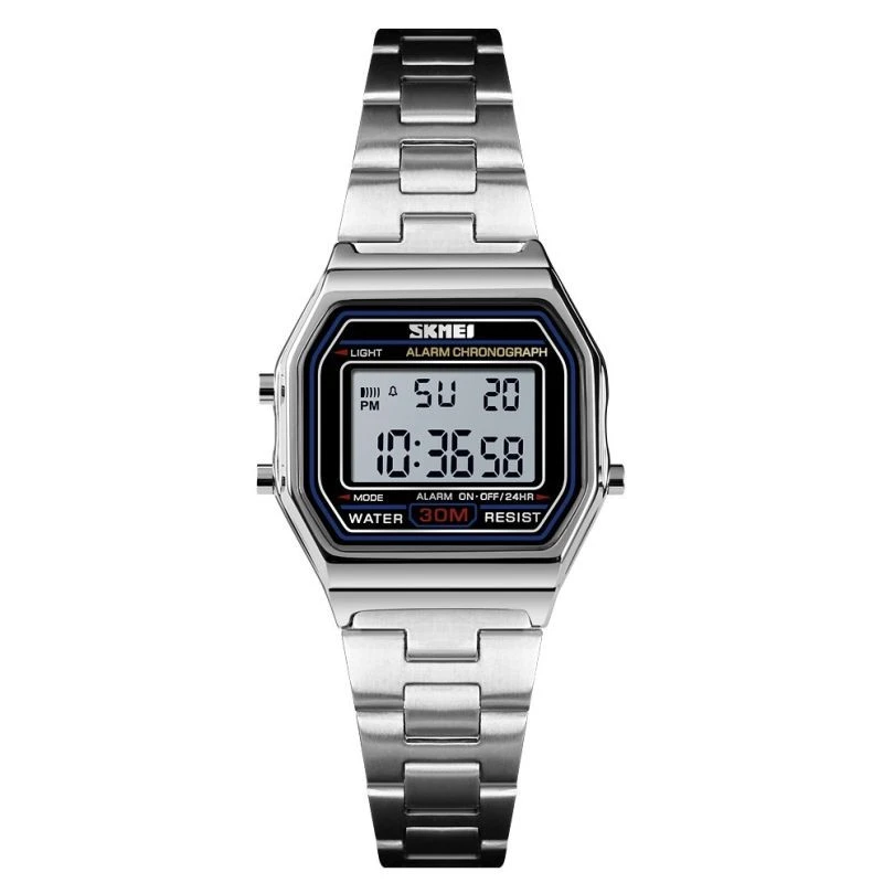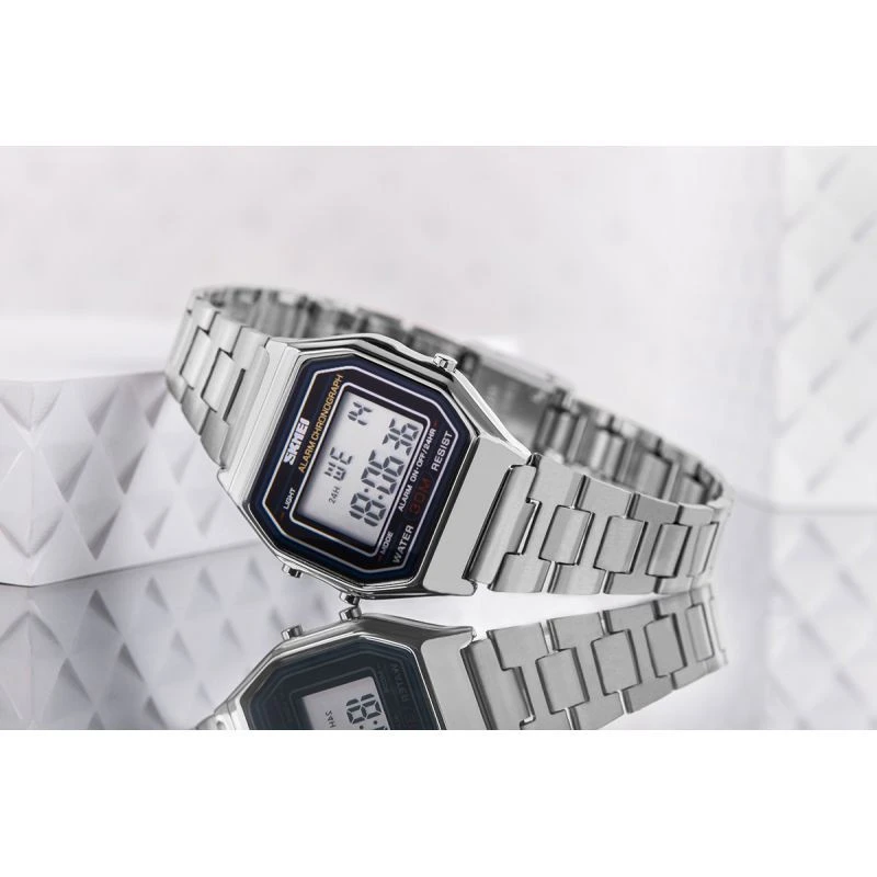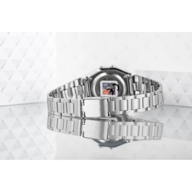 Stylový retro model, který zaujme na první pohled klasickým digitálním displejem a elegantním stříbrným náramkem z nerezové oceli. Obdélníkový plášť v metalickém provedení mu dodává jedinečný půvab a připomíná nadčasové trendy 80. let. Hodinky jsou vybaveny funkcemi, jako je alarm, stopky a vodotěsnost 30 m, a dokonale tak odpovídají potřebám dnešní aktivní ženy.