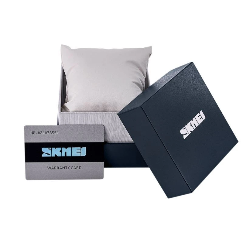 Každé hodinky Skmei jsou dodávány se stylovou krabičkou, která je dokonalým doplňkem sady. Tmavě modrá krabička s decentním logem Skmei hodinky nejen chrání, ale také jim dodává jedinečný charakter. Vnitřek krabičky je vyložen měkkým polštářkem, který hodinky bezpečně podepře, zvýrazní jejich detaily a zajistí jejich elegantní prezentaci.