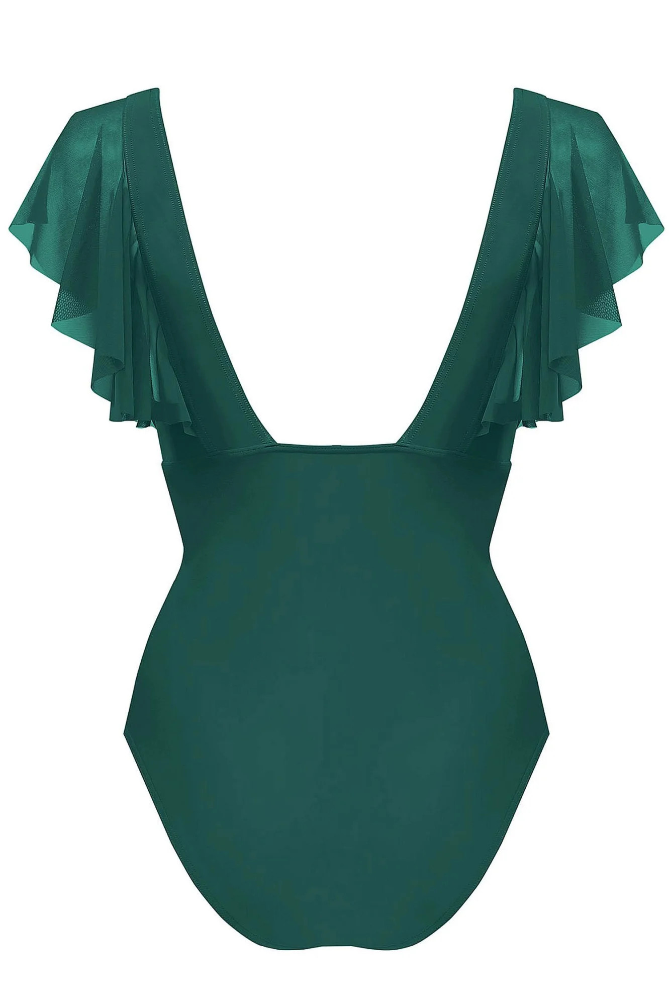 Dámské jednodílné plavky Canoy 16 1086S 7 SELF - zelená barva - z vysoce jakostního mikrovlákna - košíčky bez vycpávek - pozlacená ozdoba mezi košíčky - volánkové rukávy - jemná síťovina pod prsy - hluboký výřez na zádech - elastický pas opticky zeštíhluje postavu - rychleschnoucí materiál, odolný proti chlóru a slunci