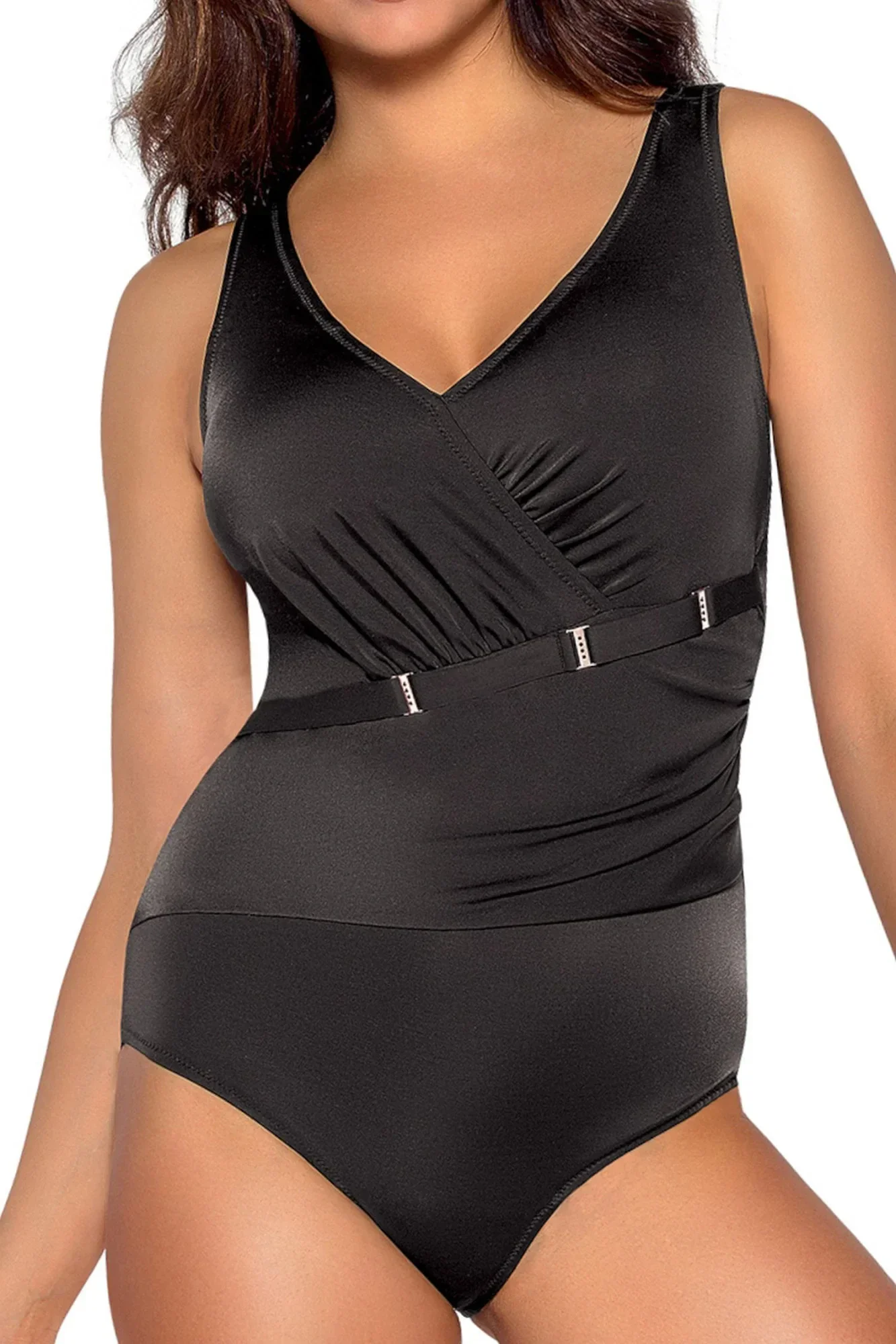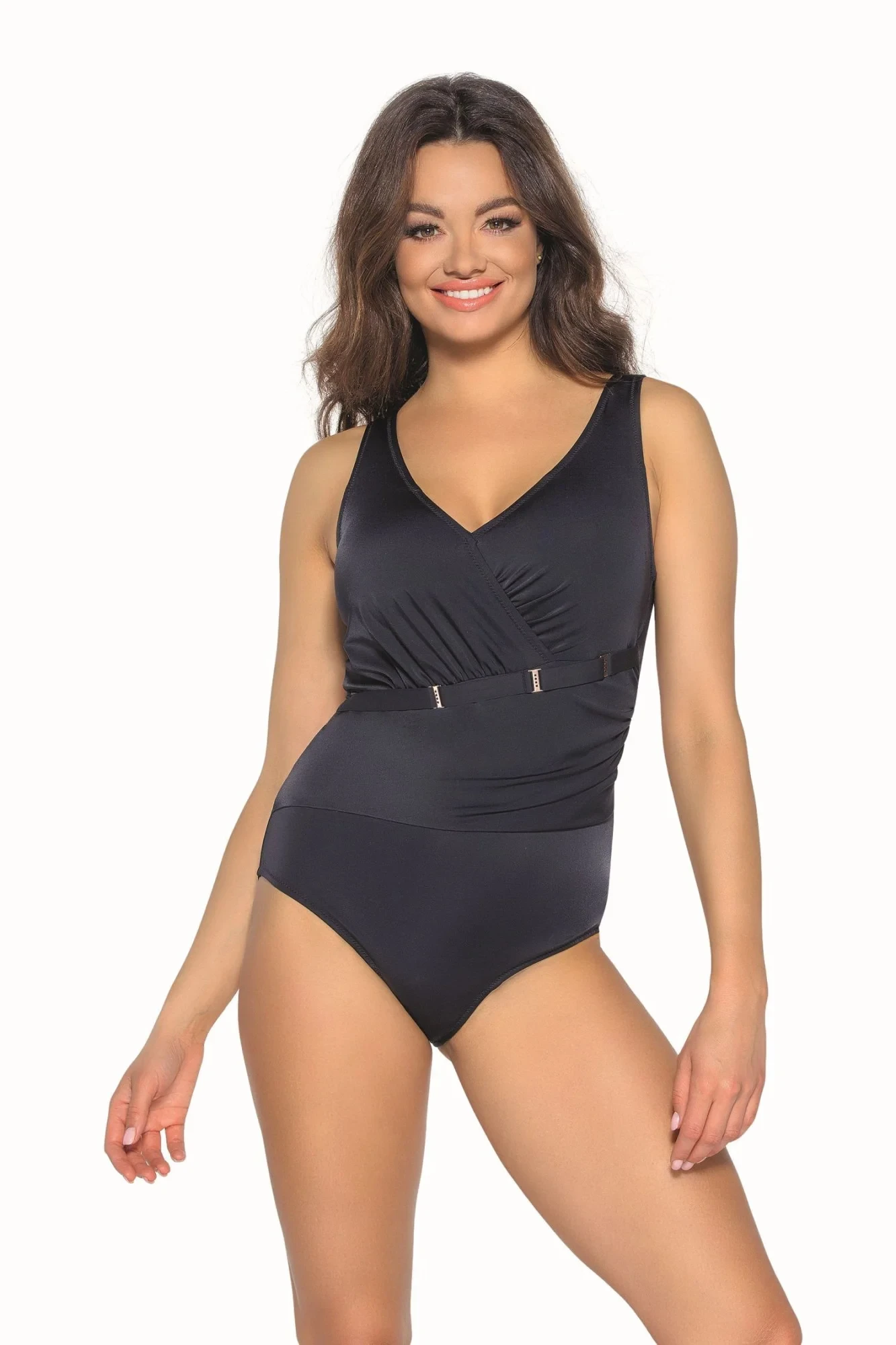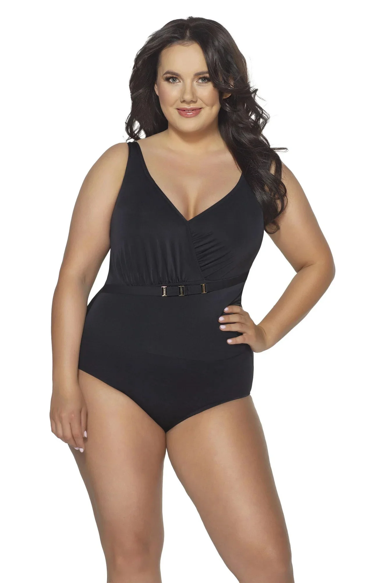 Dámské jednodílné plavky 48 black plus AVA - černá barva - z hladkého mikrovlákna - asymetrický střih - opticky zeštíhlí postavu - přední díl modelu je z vnitřní strany podšitý vrstvou síťoviny - všité košíčky udrží poprsí na správném místě - ozdobný pásek v pase - zadní část i přes hluboké vykrojení na zádech hladce přilnou k tělu a zabraňují klouzání ramínek