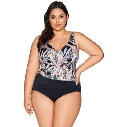 Dámské jednodílné plavky 61 black plus AVA - černá barva - široké popruhy - ozdobné nařasení opticky zeštíhlující pas - elegantní rostlinný potisk - skryté elastické košíčky - Kick cups