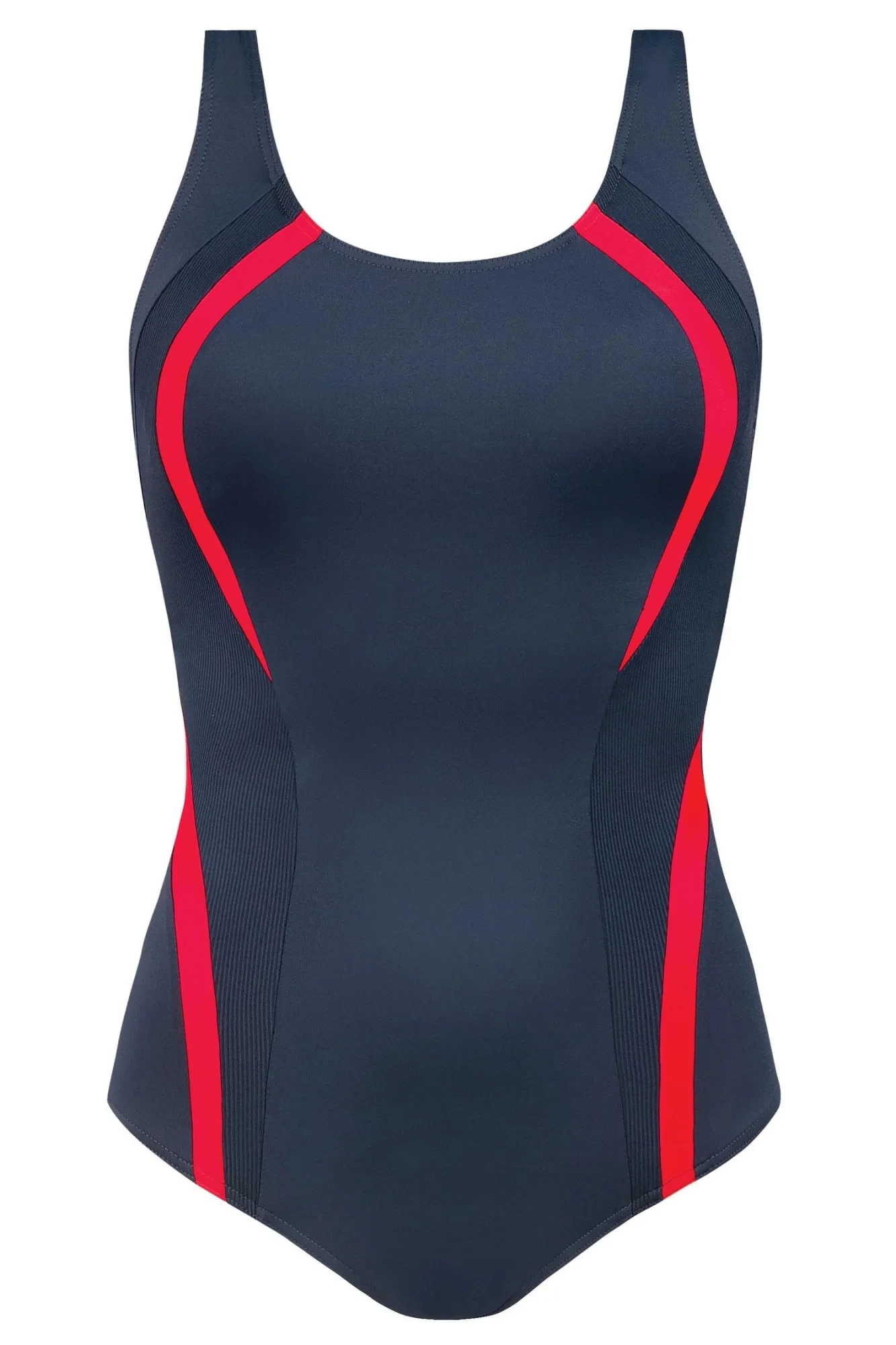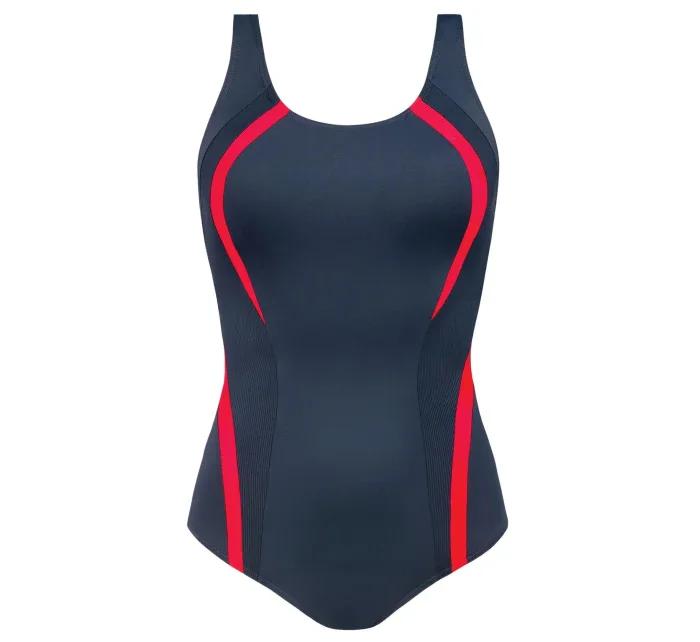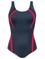 Dámské jednodílné plavky Atlantic sport 34A1 25 SELF - tmavě modrá barva - z vysoce jakostního materiálu - jemně vyztužené košíčky - barevné vsadky na bocích - širší ramínka s regulací - rychleschnoucí materiál, odolný proti chlóru a slunci