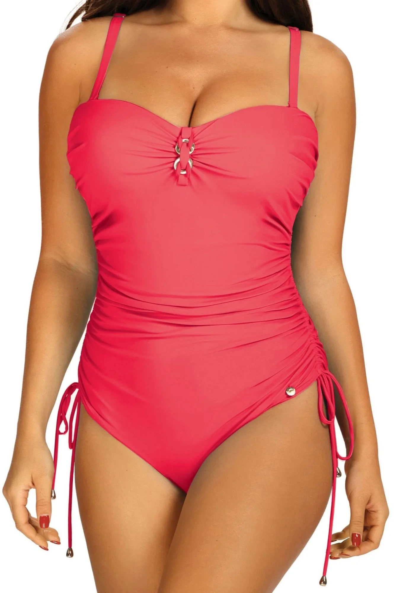 Dámské jednodílné plavky Bayamon 13 8030BM13 2 SELF - růžová barva - polstrované košíčky - mezi košíčky řasení s ozdobou - vázání na bocích - nastavitelná a neodepínatelná ramínka - rychleschnoucí materiál, odolný proti chlóru a slunci
