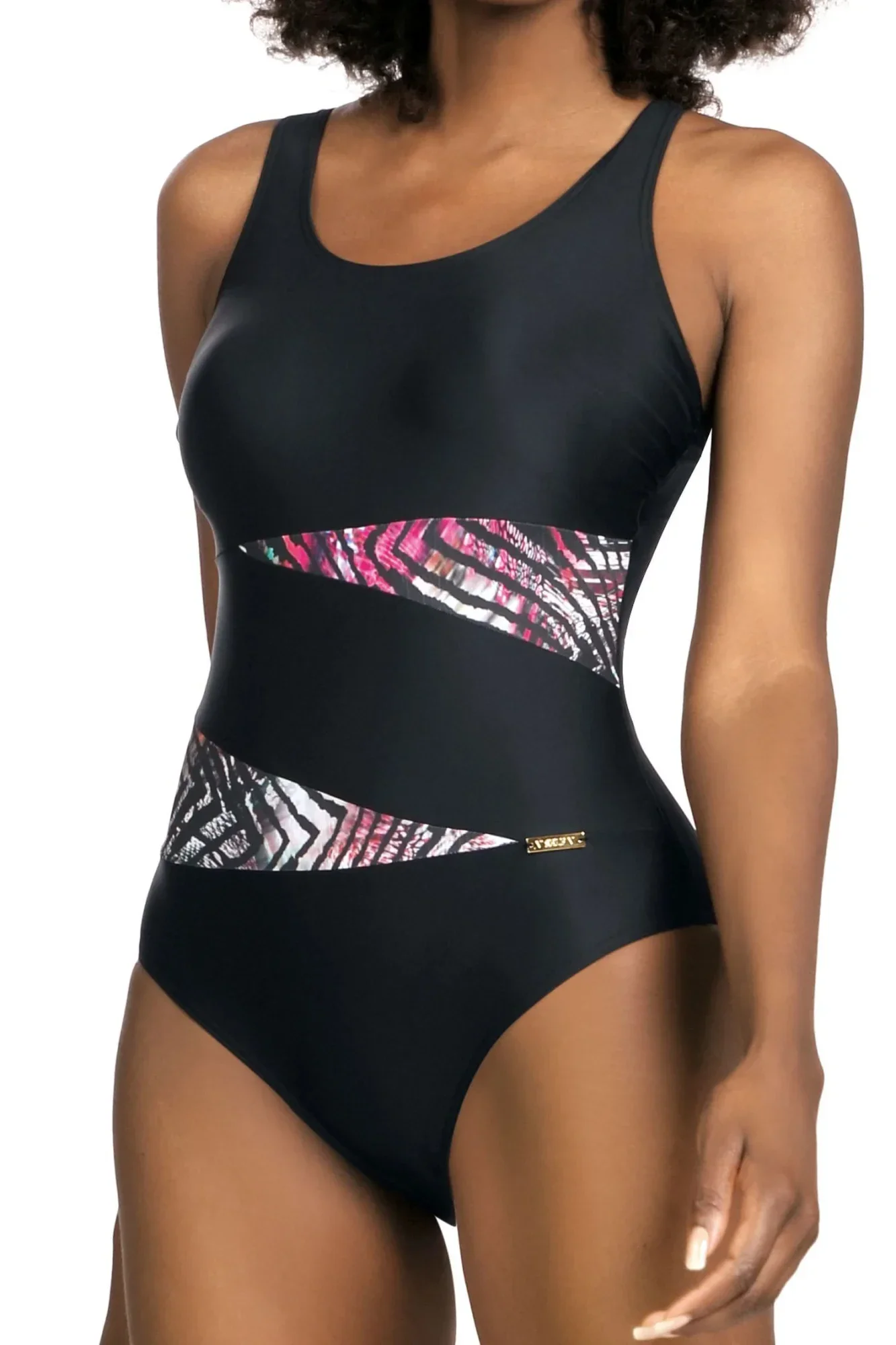 Dámské jednodílné plavky S36 19F Fashion sport SELF - černá barva - sportovní střih - široká a posuvná ramínka - vyztužené košíčky - vsadky ze vzorovaného mikrovlákna