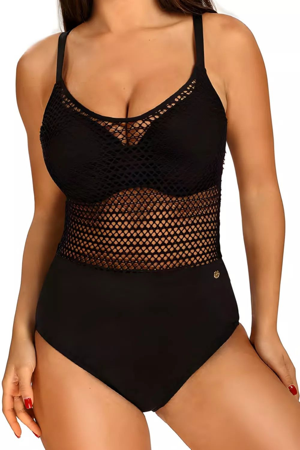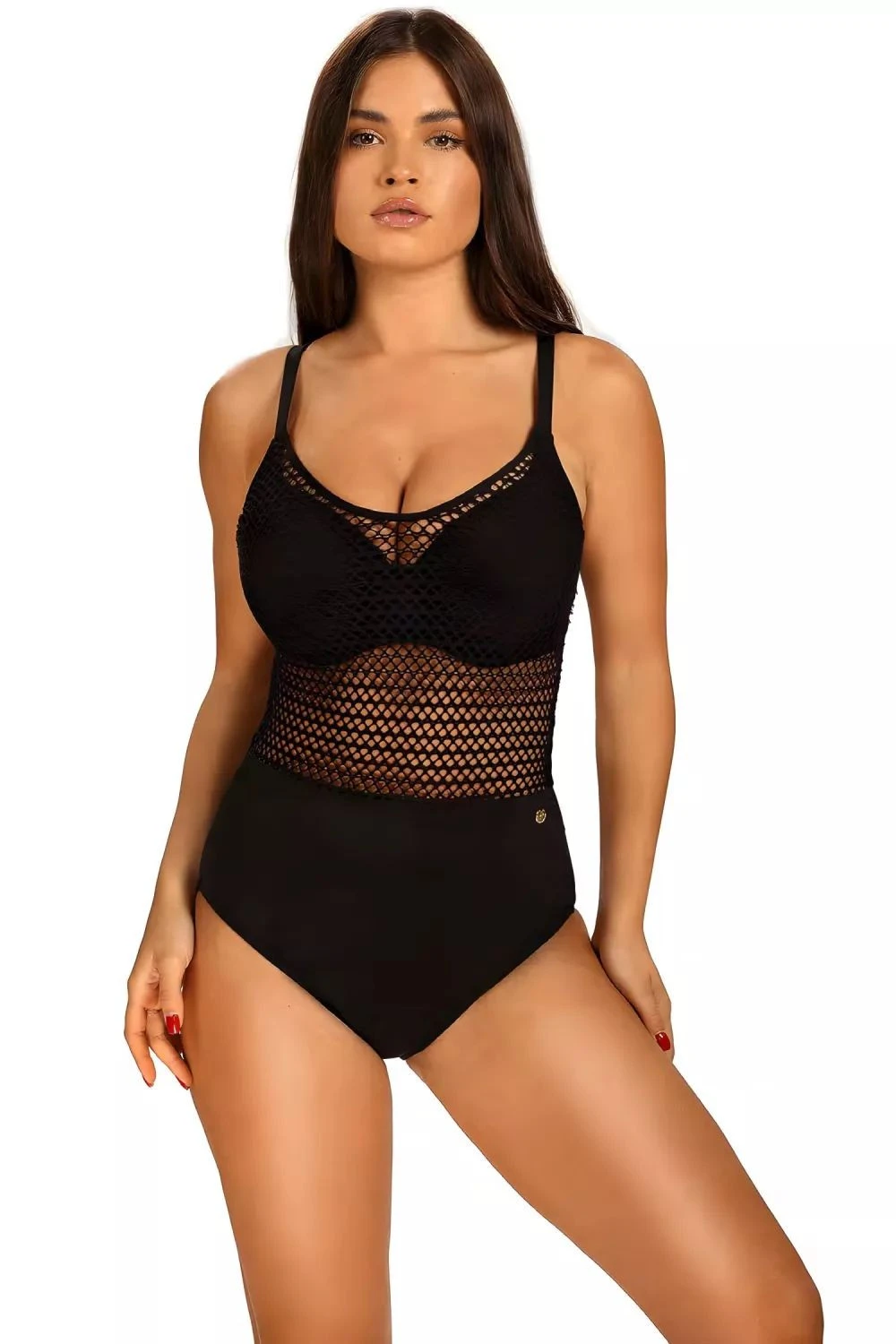 Dámské jednodílné plavky Lili5 964LI5 19 SELF - černá barva - z vysoce jakostního vlákna - vyztužená podprsenka - s kosticemi - zdobené síťovinou s velkými oky - výřez na zádech - nastavitelná a neodepínací ramínka