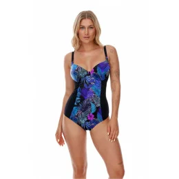 Jednodílné plavky vytvořené pro ženy s plnějšími tvary, ideální na pláž i do bazénu. Střih plavek kombinuje funkčnost a eleganci. Plavky mají všitou podprsenku s měkkými košíčky s kosticemi a nastavitelnými neodnímatelnými ramínky. Šířka a typ ramínek jsou přizpůsobeny velikosti plavek. Černé látkové vsadky na bocích opticky zeštíhlují a tvarují siluetu. Květinový pletený motiv v modrých odstínech připomíná rajské pláže, které jsou spojovány s bezstarostnou letní dovolenou. Zadní díl plavek se zapíná na přezku.