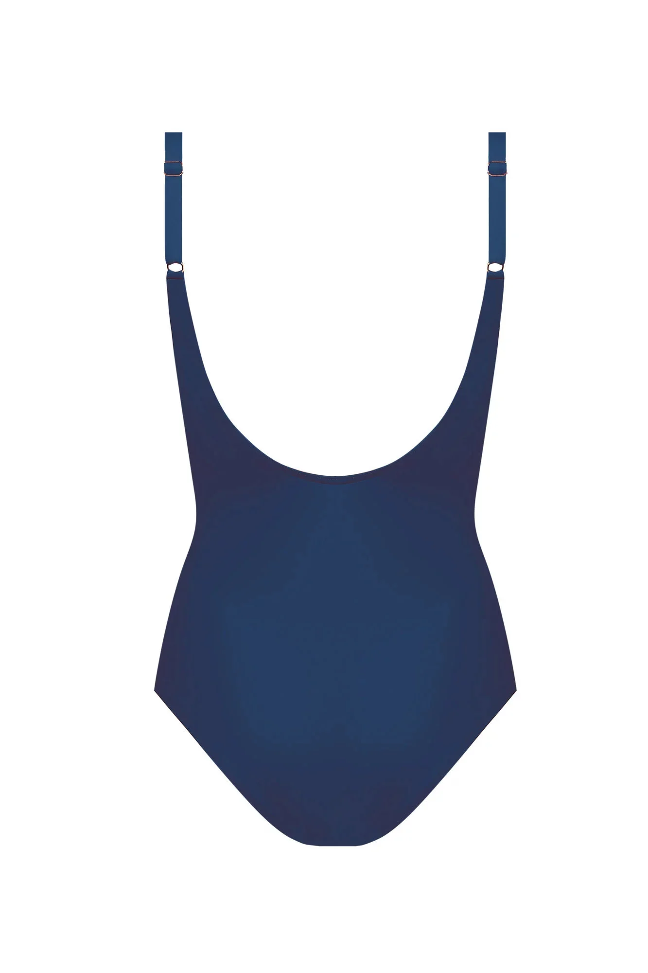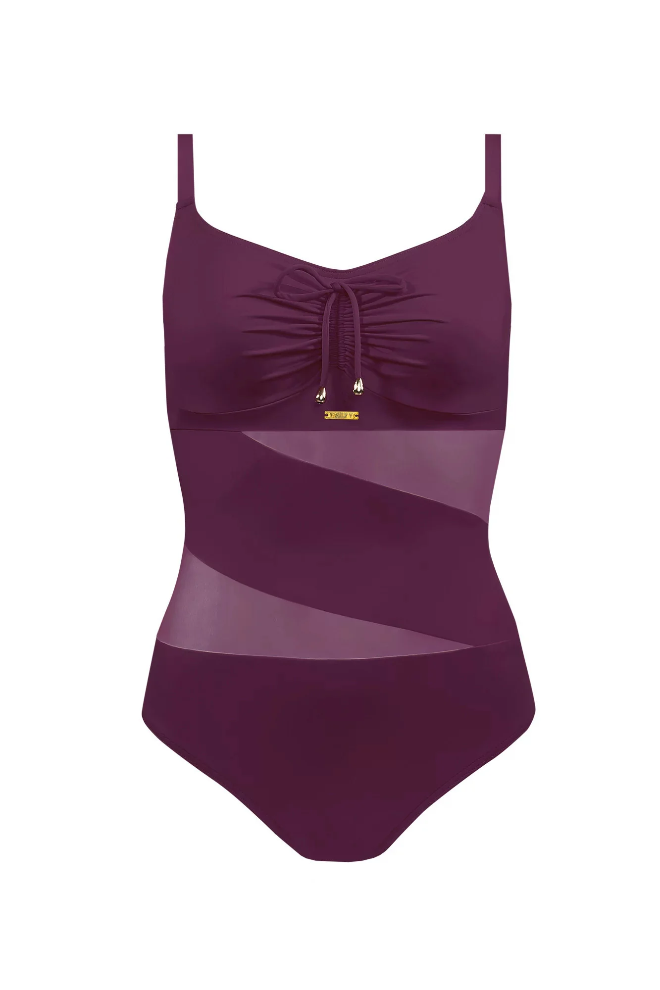 Dámské jednodílné plavky s rafinovanou síťovanou vsadkou. Košíčky jsou vyztužené, s kosticí. Mezi prsy je možné plavky stáhnout sňůrkou. Ramínka mají kovové posouvání.