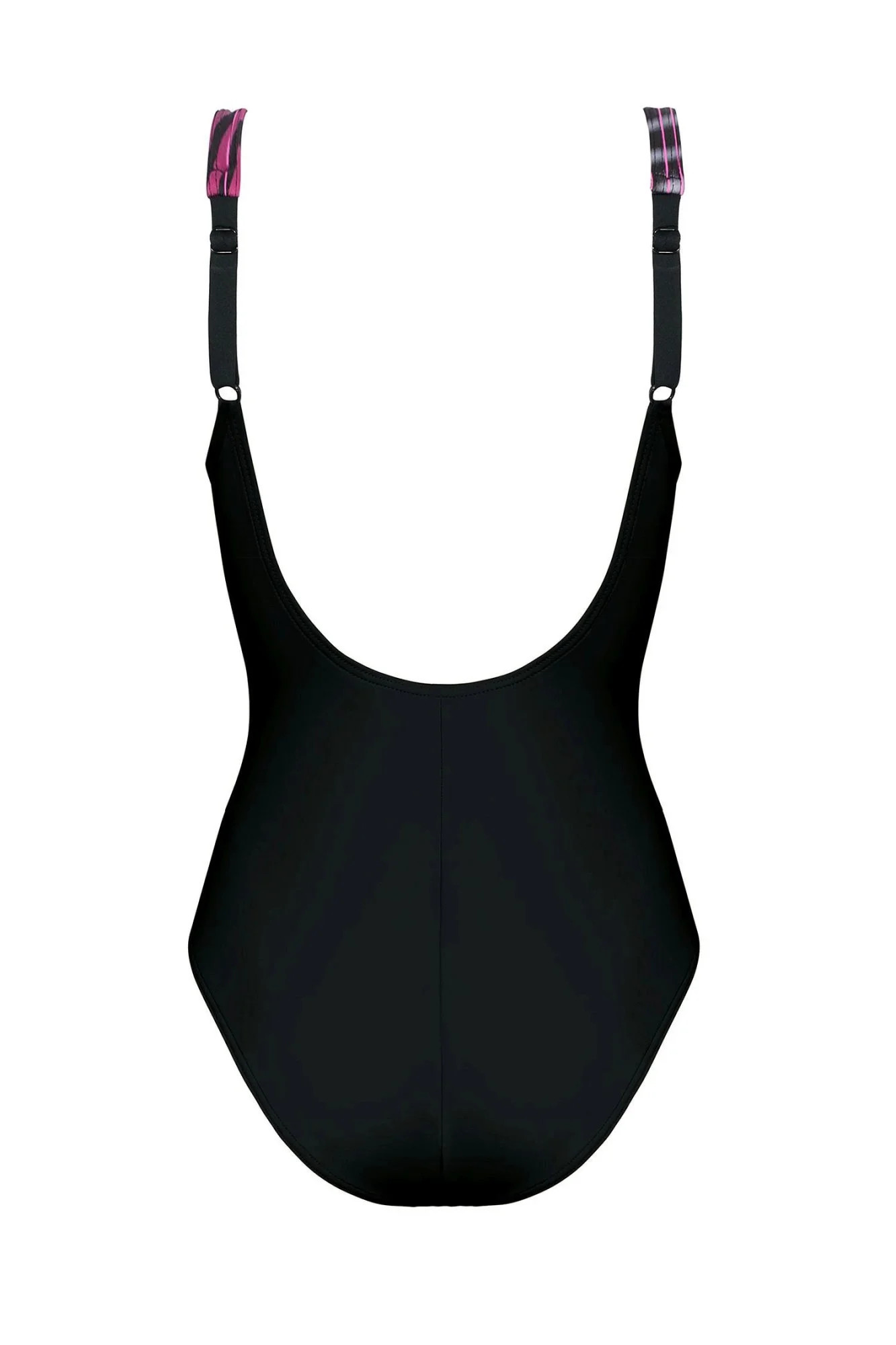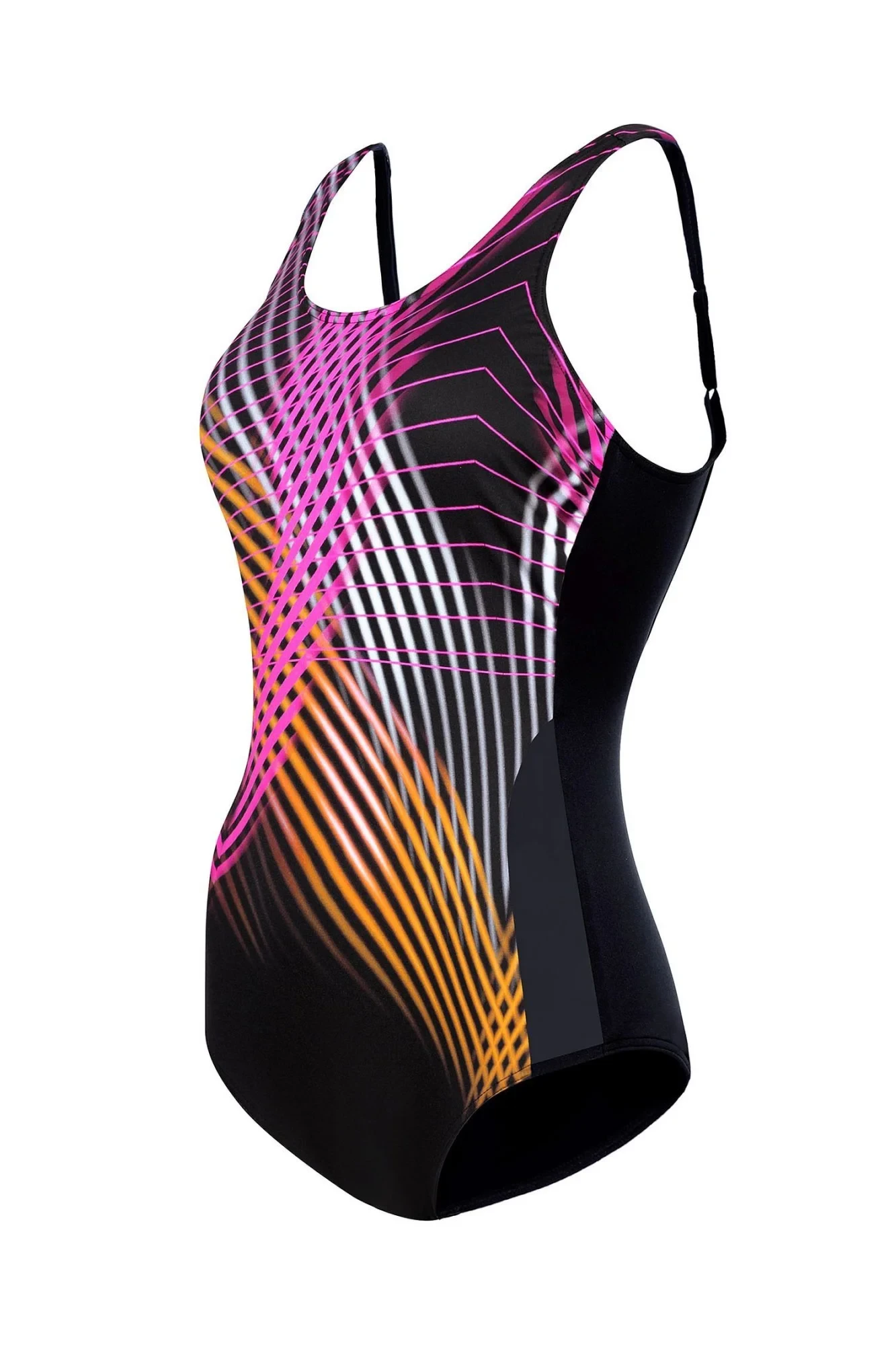 Dámské jednodílné plavky Trends sport 36PW-4 black SELF - černá barva - ozdobené na přední straně barevným vzorem - zadní část černé barvy - boky z transparentní síťoviny - vyztužené košíčky - bez kostic - nastavitelná širší ramínka - odolné proti chloru