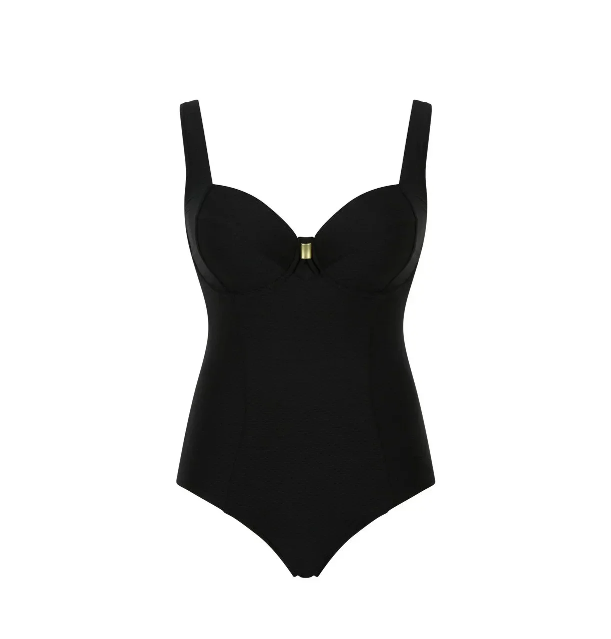 Romantické plavky z kolekce Marianna značky Panache jsou ideální pro váš malý útěk. Elegantní a zároveň stylový kousek ve snové černé barvě. Košíčky s kosticemi dokonale vytvoří zvýrazněnou postavu a zároveň poskytnou požadovanou oporu. Mezi poprsím je navíc přidán malý zlatý obtisk, který okouzlujícímu kousku dodává punc luxusu. Do živůtku jsou vetknuty zeštíhlující panely, které nabízejí ještě lichotivější styl. Mírné zakrytí zadního dílu pokračuje v elegantním tématu. Vnitřní panely ze síťoviny Power Mesh nabízejí mírnou kontrolu bříška, která přidává další vyhlazující prvek.