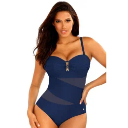 Dámské jednodílné plavky, košíčky vyztužené, podšité gumou. Mezi prsy luxusní stahovací ozdoba animal stylu. Přední díl je rafinovaně prošívaný průhledným tylem, co působí svůdně. Vzadu zapínání na sponu. Ramínka posouvací, je možné je odepnout.