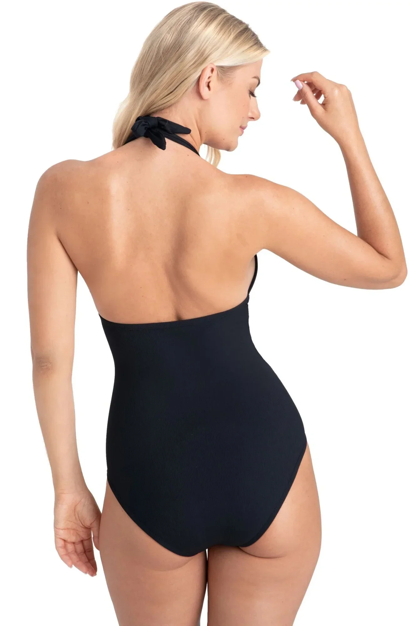 Dámské jednodílné plavky Venus I140 Samanta - černá barva - z kvalitního španělského mikrovlákna - košíčky podprsenky jsou výškově nastavitelné - zapínání a nastavovací prvky v barvě žlutého zlata - zavazování za krkem - žebrovaný úplet opticky zeštíhlí Vaši siluetu - certifikát Oeko-Tex STANDARD 100®Materiálové složení: 88% polyamid + 12% elastan