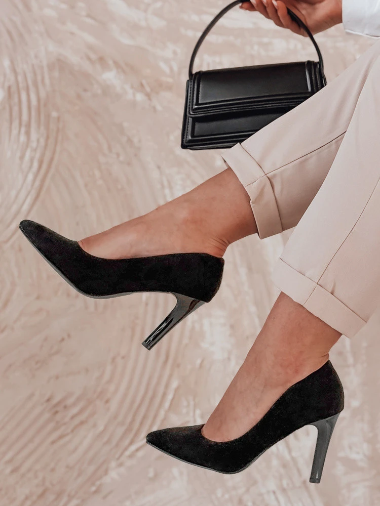 Kožené jehlové podpatky na lakovaném 9 cm vysokém sloupku jsou kombinací klasiky a moderní elegance. Štíhlá linie podtrhuje tvar chodidla, zatímco měkká kožená stélka zajišťuje pohodlí. Univerzální střih je ideální pro každodenní nošení i speciální příležitosti a dodá každému outfitu šmrnc.