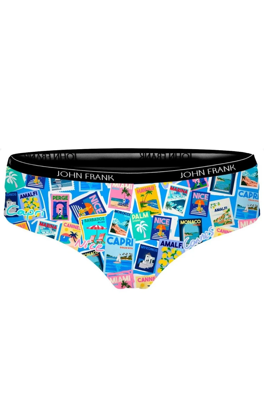Dámské kalhotky střihu hipster od značky John Frank z vysokého podílu bavlny. Kalhotky s módně zpracovaným potiskem jsou velmi příjemné na dotek a pohodlné při nošení. Jemná, středně široká guma v pase má kolem logo John Frank. Do vnitřního dílu je zapracován bavlněný klínek pro komfortní nošení.