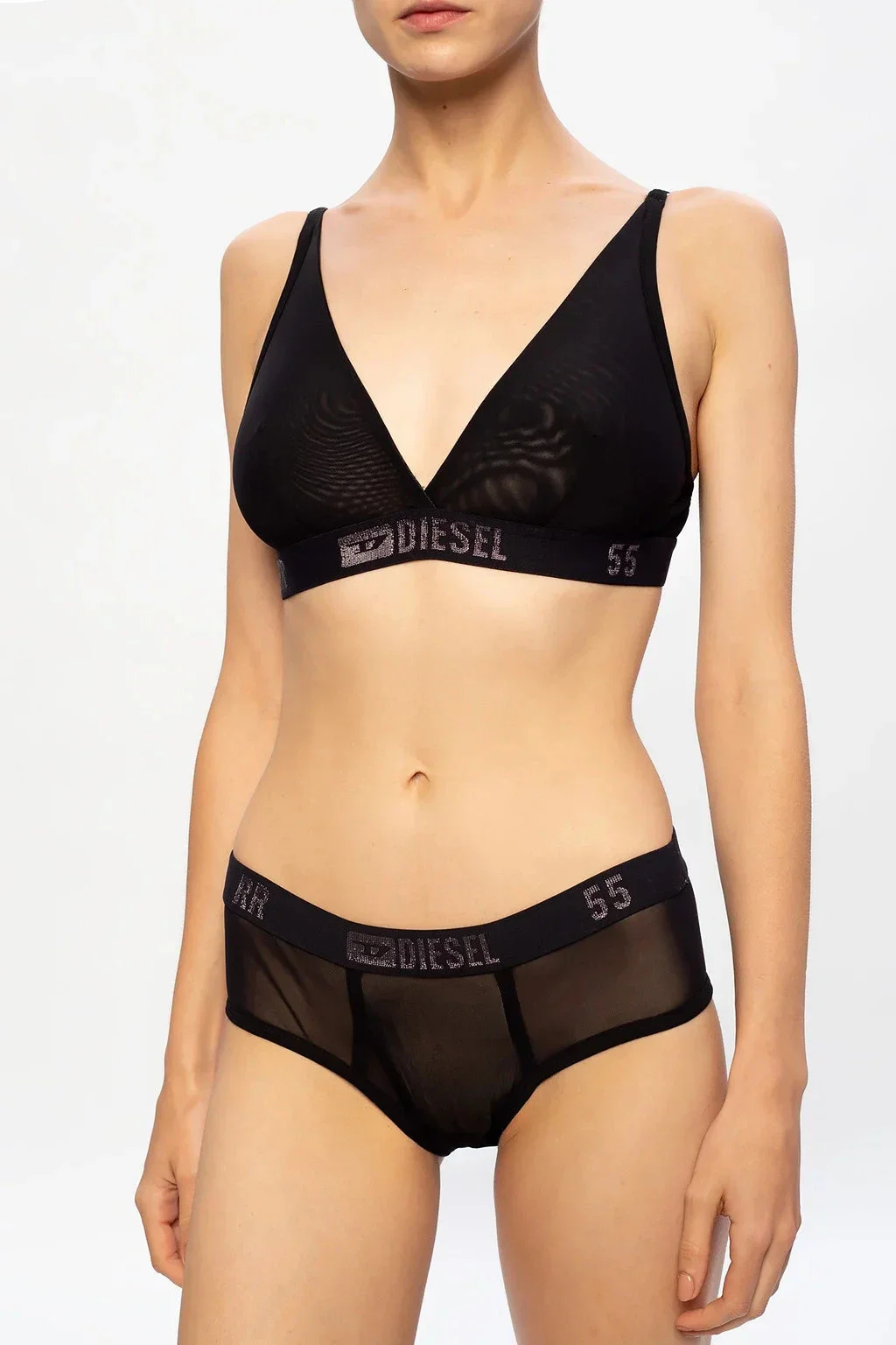 Černé kalhotky od Diesel. Tento pár je vyroben z poloprůhledné síťoviny a má elastický pas zdobený logem štítku vyšívaným stříbrnou lurexovou přízí.