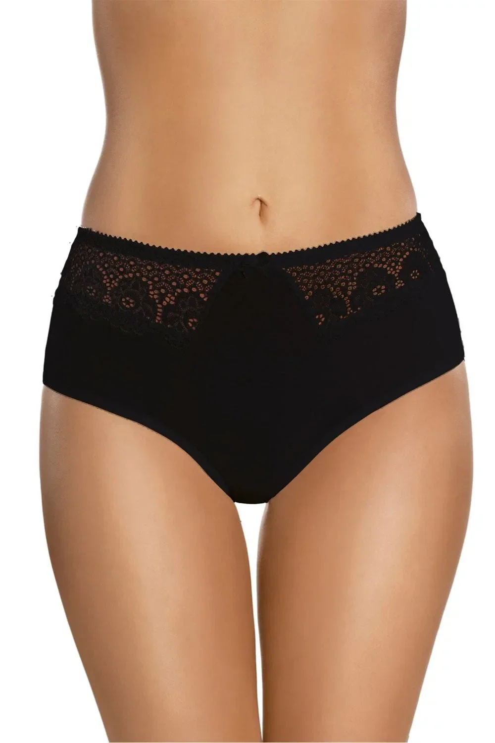 Dámské kalhotky 063 Gabidar - černá barva - kalhotky mají klasický střih a lehce zvýšený pas - na přední straně mají jemnou krajku se vzorem - elegantní design - na horním lemu roztomilá mašličkaMateriálové složení: 95% bavlna + 5% elastan