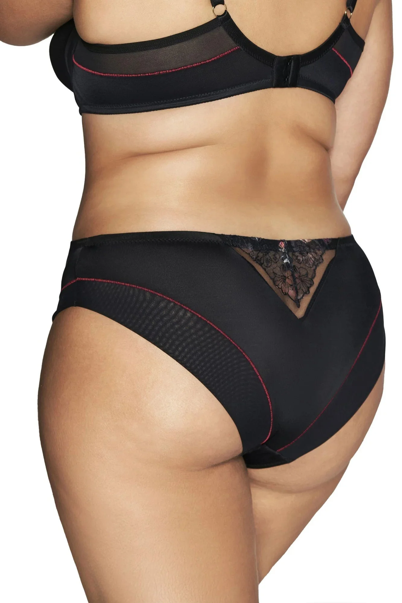 Dámské kalhotky 2122 Intense AVA - černá barva - z hladkého elastického materiálu - kombinace transparentního tylu s barevnou výšivkou - na přední části je ozdobená jemnou bižuterií - ozdobné červené švy na bocích - na zadní části je ozdobná aplikace ve tvaru trojúhelníku