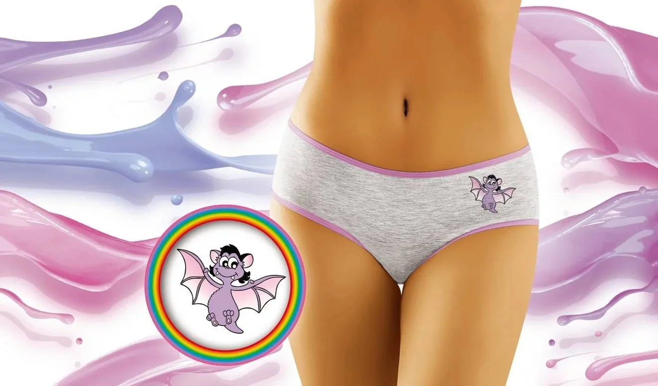 Seznamte se s nejnovější kolekcí spodního prádla značky Wol-bar! Řada Funny se vyznačuje nápaditými, vtipnými potisky, zajímavými barvami a především nejvyšší kvalitou (přírodní vlákna, nejlepší úplet a střih, který dbá na vaše pohodlí a komfort). Tato verze je téměř jako Drákula - sladký, fialový netopýr se dvěma ostrými tesáky...
