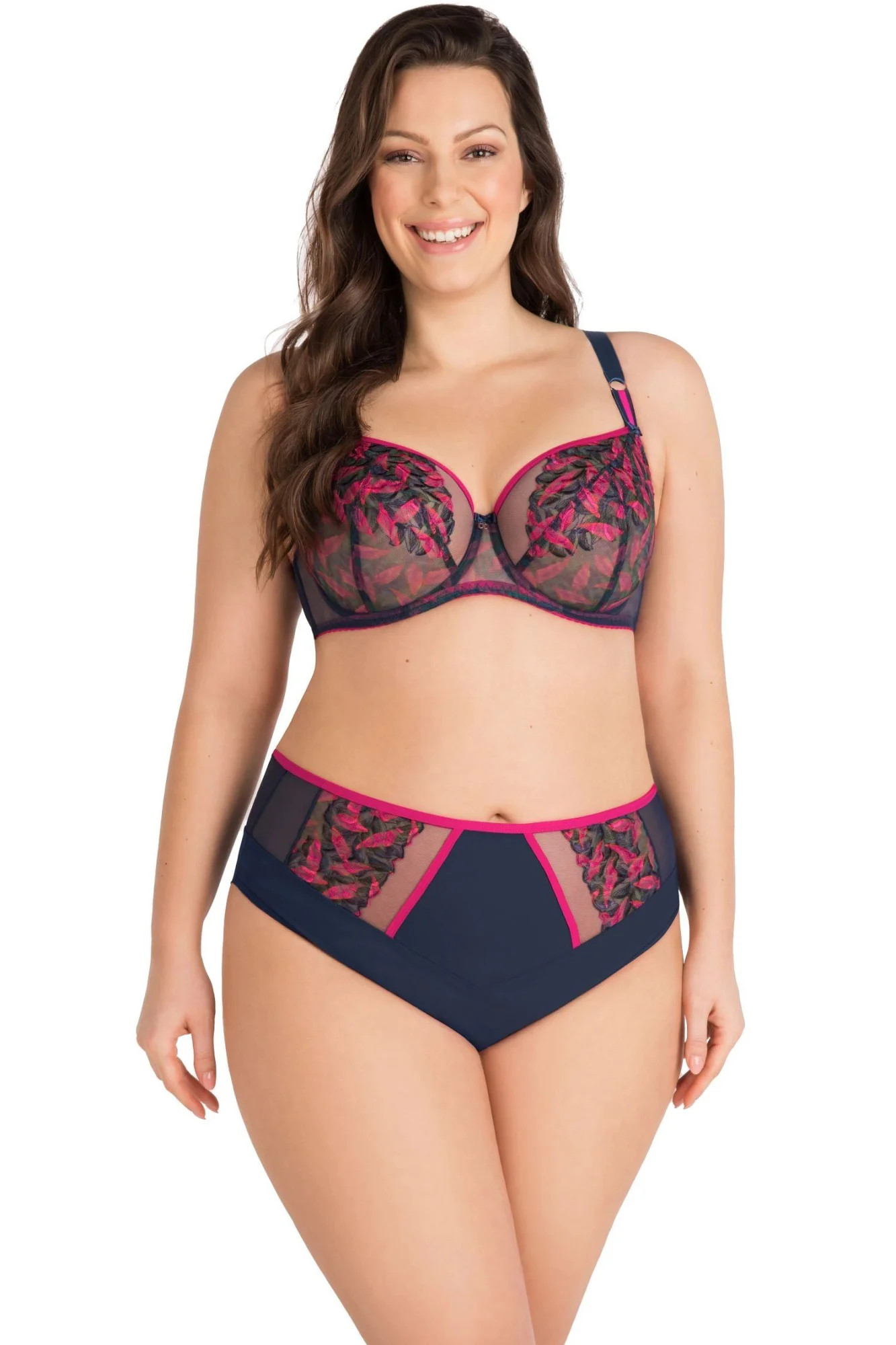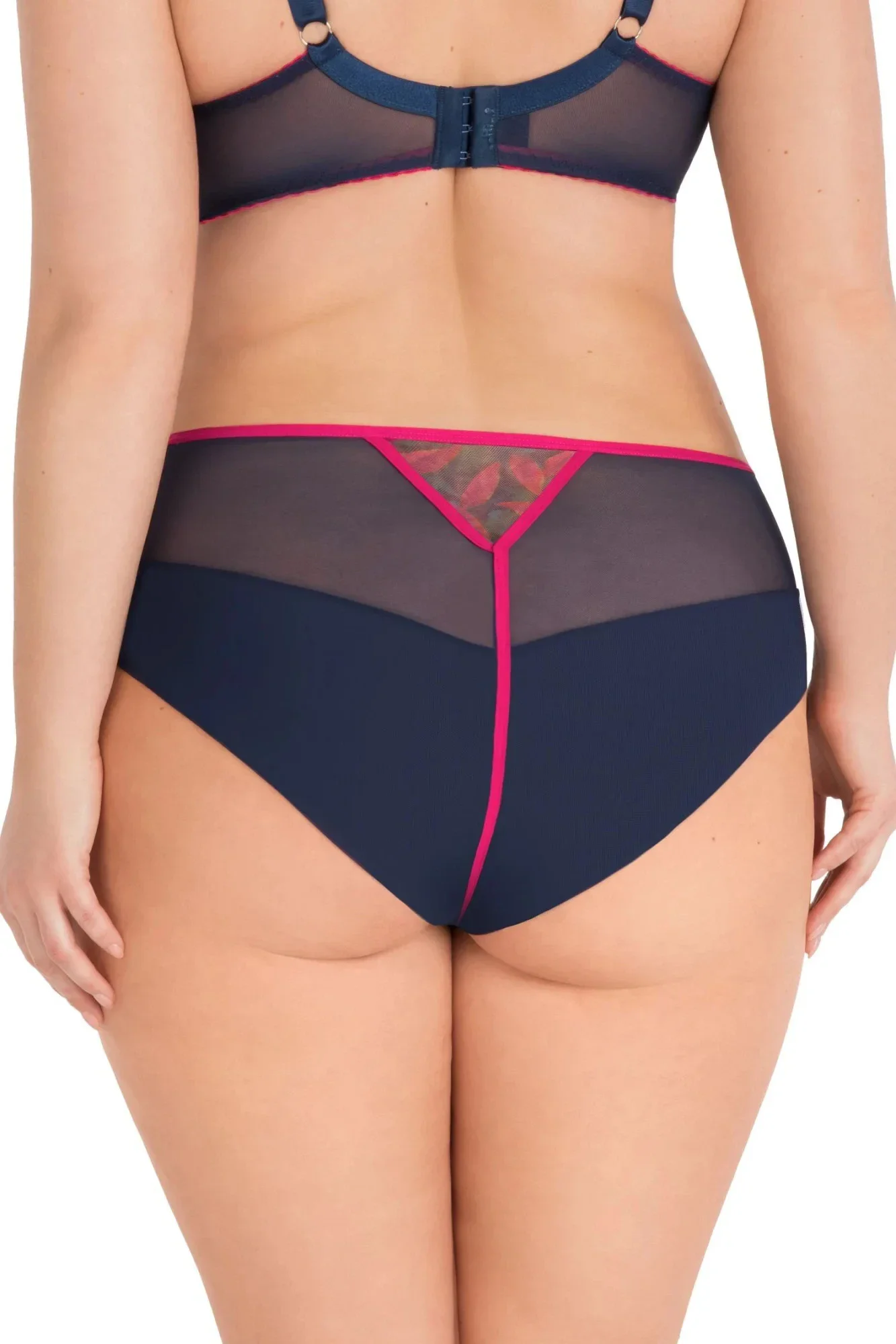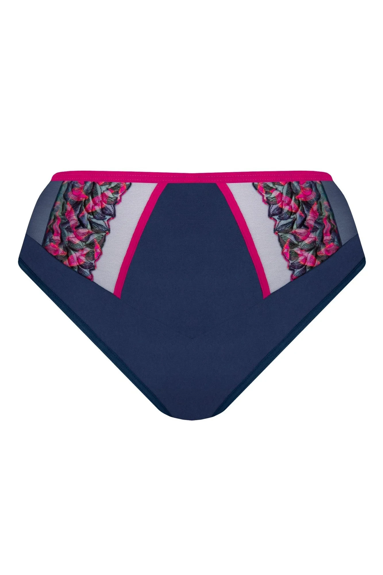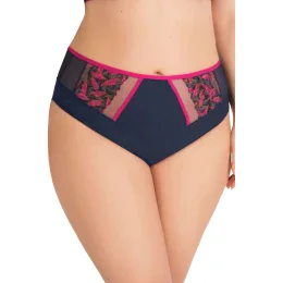 Dámské kalhotky 790 Kayla GORSENIA - tmavě modrá barva - vyšší pas - z pružného tylu - přední část zdobená fuchsiovou výšivkou s květinovým motivem - na bocích plné
