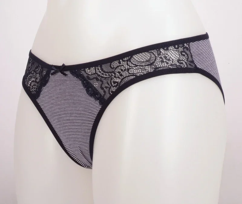 Dámské kalhotky Andy. Zajímavě řešené dámské kalhotky mají boky z krajky a porstřední část z pruhované látky. Použitý materiál je jemný a poddajný na dotek.