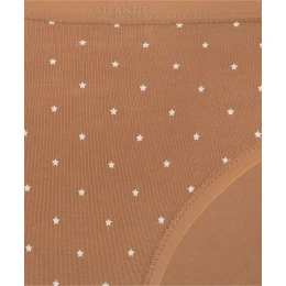 Trojbalení obsahuje dámské kalhotky v těchto barvách: tmavě béžová - pokrytá drobnými srdíčkovými vzory, růžová - pokrytá tečkami a tmavě amarantová - s měsíci a planetami. Kalhotky mají sportovní charakter. Jejich pas je nízko a boky mají univerzální šířku. V pase jsou kalhotky zakončeny nekompresivním lemováním s nápisy Atlantic. Naše látka je také extrémně šetrná k pokožce - je prodyšná, zabraňuje nadměrnému pocení těla a nezpůsobuje kožní alergie. Poskytuje také maximální pohodlí při nošení.