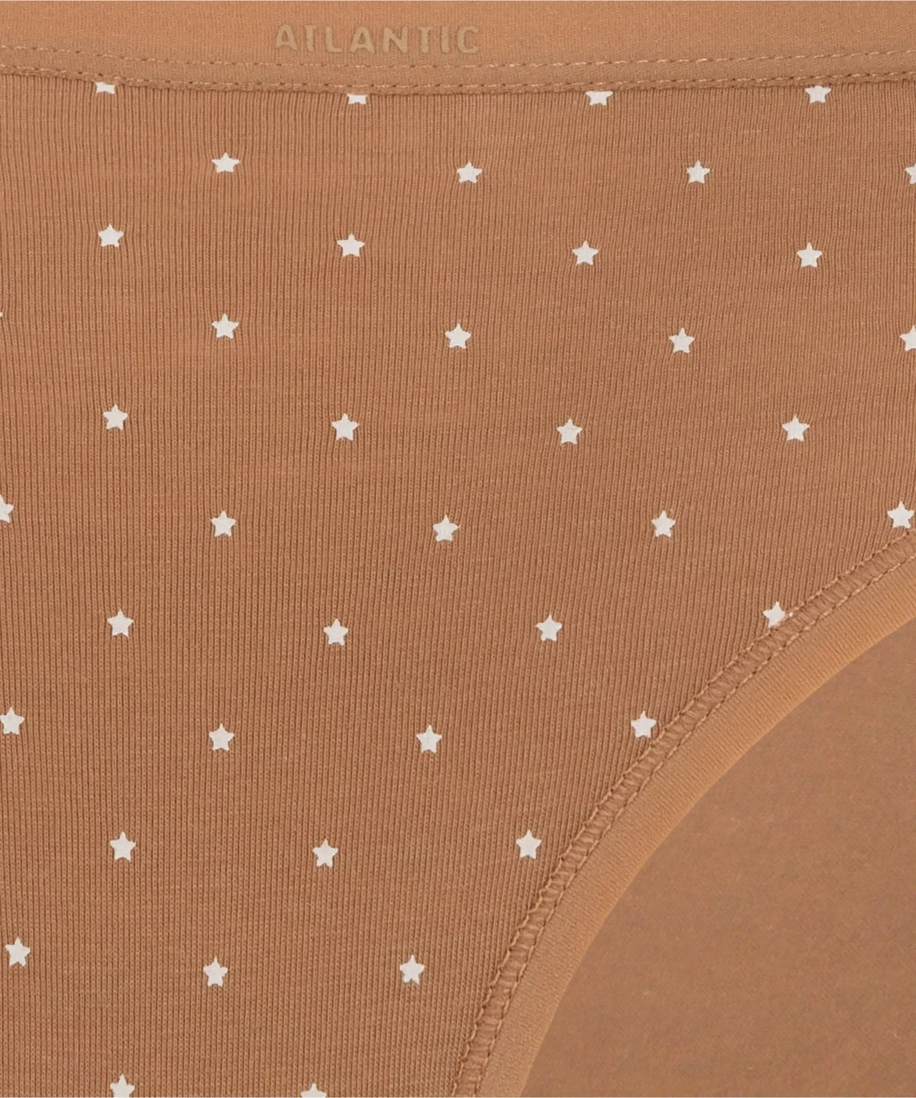 Trojbalení obsahuje dámské kalhotky v těchto barvách: tmavě béžová - pokrytá drobnými srdíčkovými vzory, růžová - pokrytá tečkami a tmavě amarantová - s měsíci a planetami. Kalhotky mají sportovní charakter. Jejich pas je nízko a boky mají univerzální šířku. V pase jsou kalhotky zakončeny nekompresivním lemováním s nápisy Atlantic. Naše látka je také extrémně šetrná k pokožce - je prodyšná, zabraňuje nadměrnému pocení těla a nezpůsobuje kožní alergie. Poskytuje také maximální pohodlí při nošení.