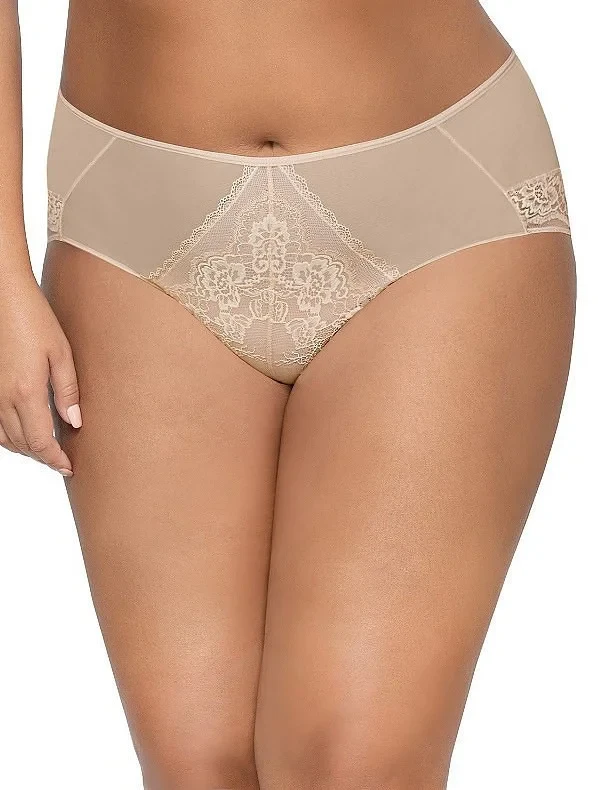 Kalhotky jsou vyrobené z jemné a pružné síťoviny a z efektní krajky s květinovým motivem. Boky modelu jsou plné. Zadní díl kalhotek je hladký, jednolitý a je ušitý z měkkého mikrovlákna.