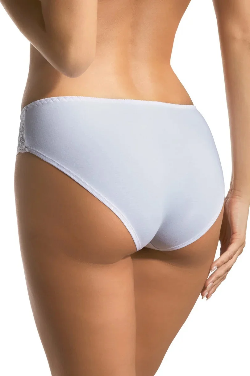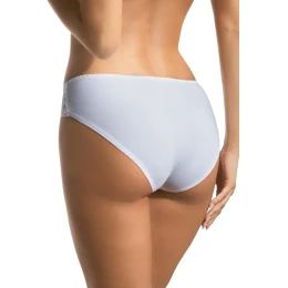 Klasické dámské mini bikiny z vysoce kvalitního bavlněného úpletu s přídavkem lycry pro dokonalé přizpůsobení postavě. Boky modelu jsou vyrobeny z měkké a na dotek příjemné krajky. Vše je zakončeno bavlněnou lamówkou. Uprostřed je malá květina.
