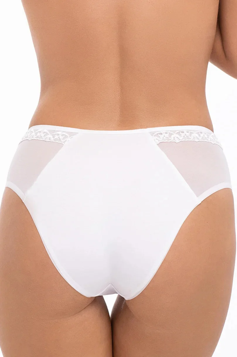 Kalhotky jsou vyrobené z velmi kvalitní a jemné bavlny. Boky modelu tvoří síťovina a krajka s květinovým motivem.