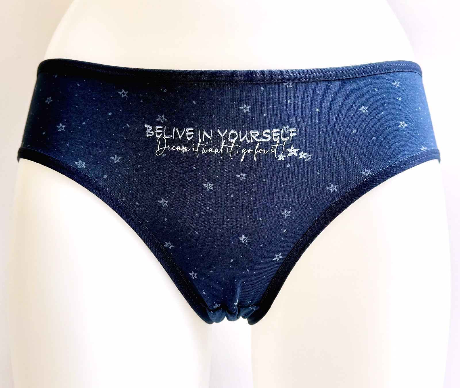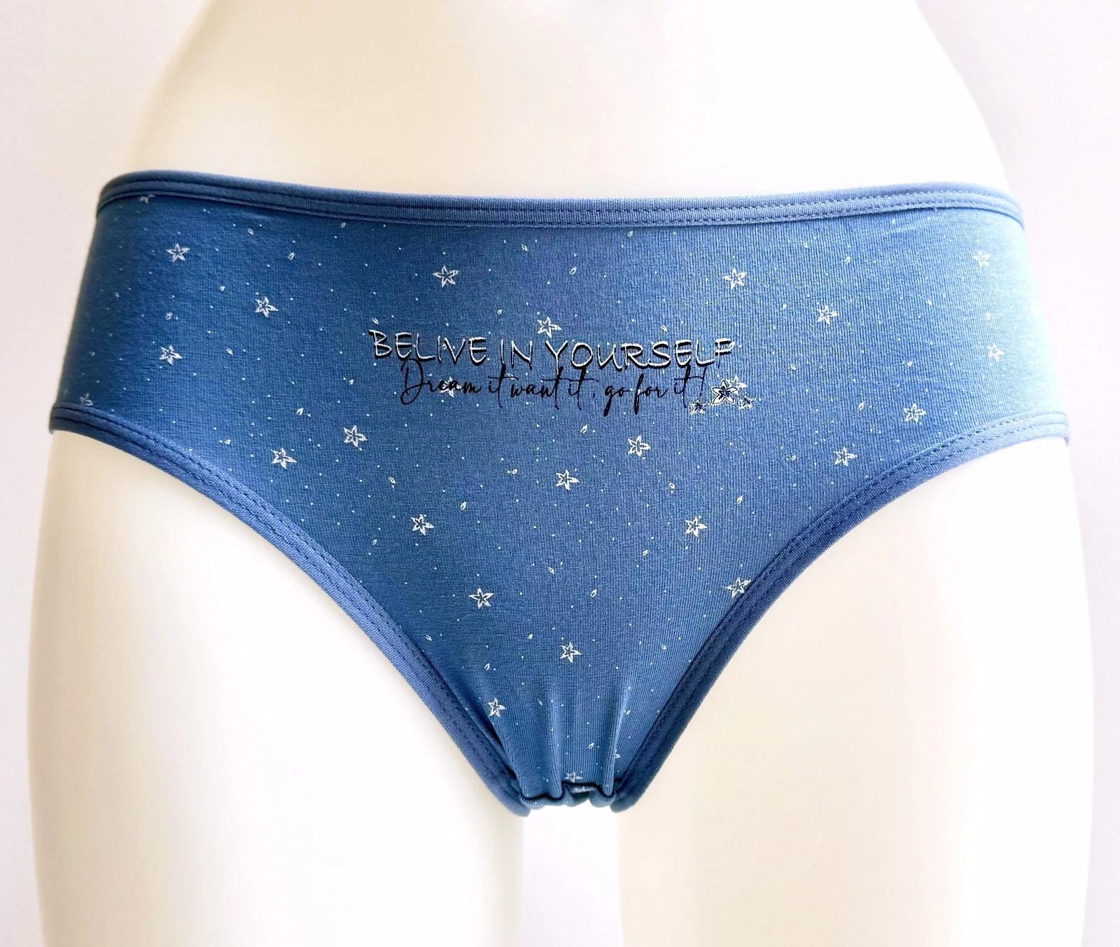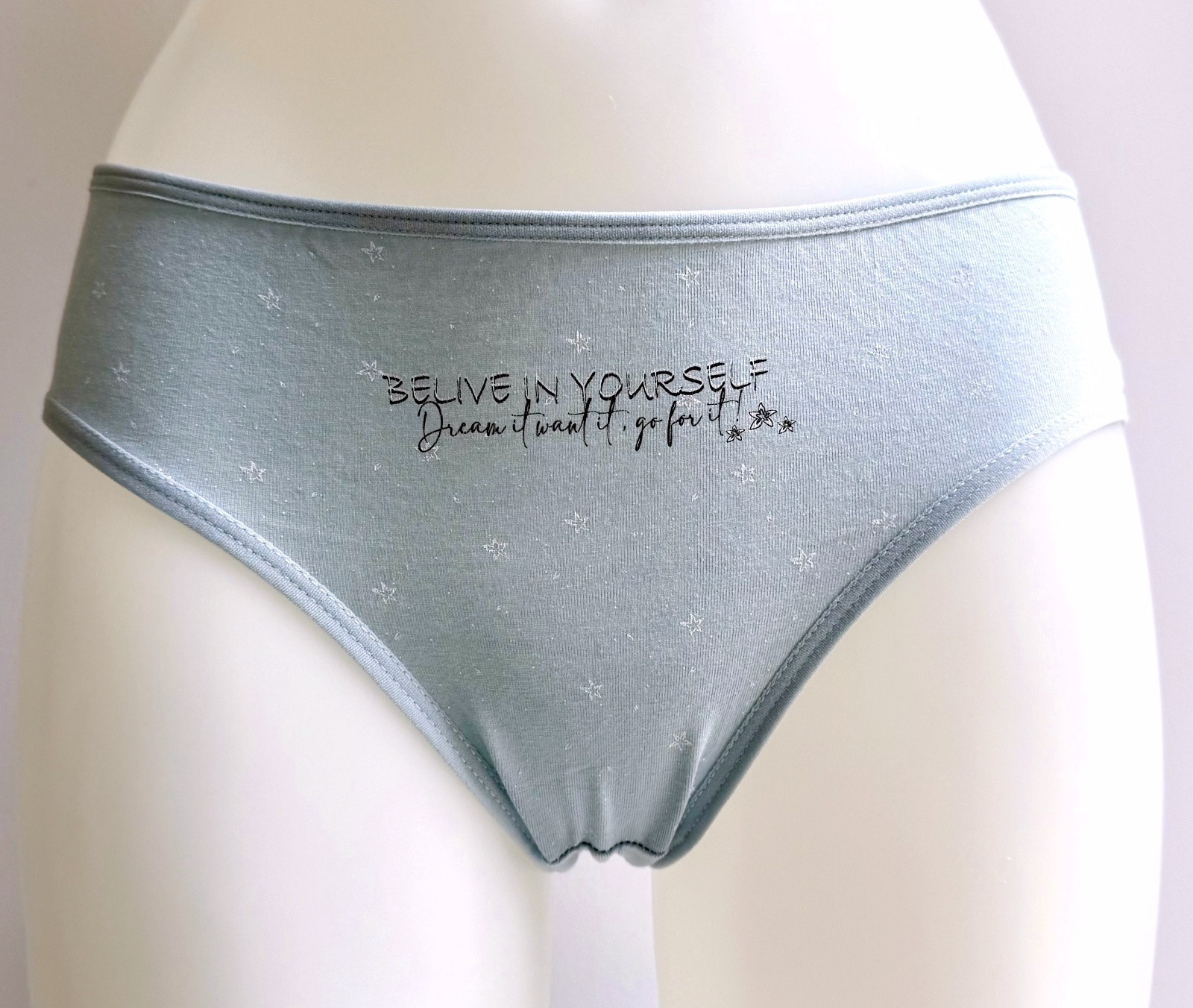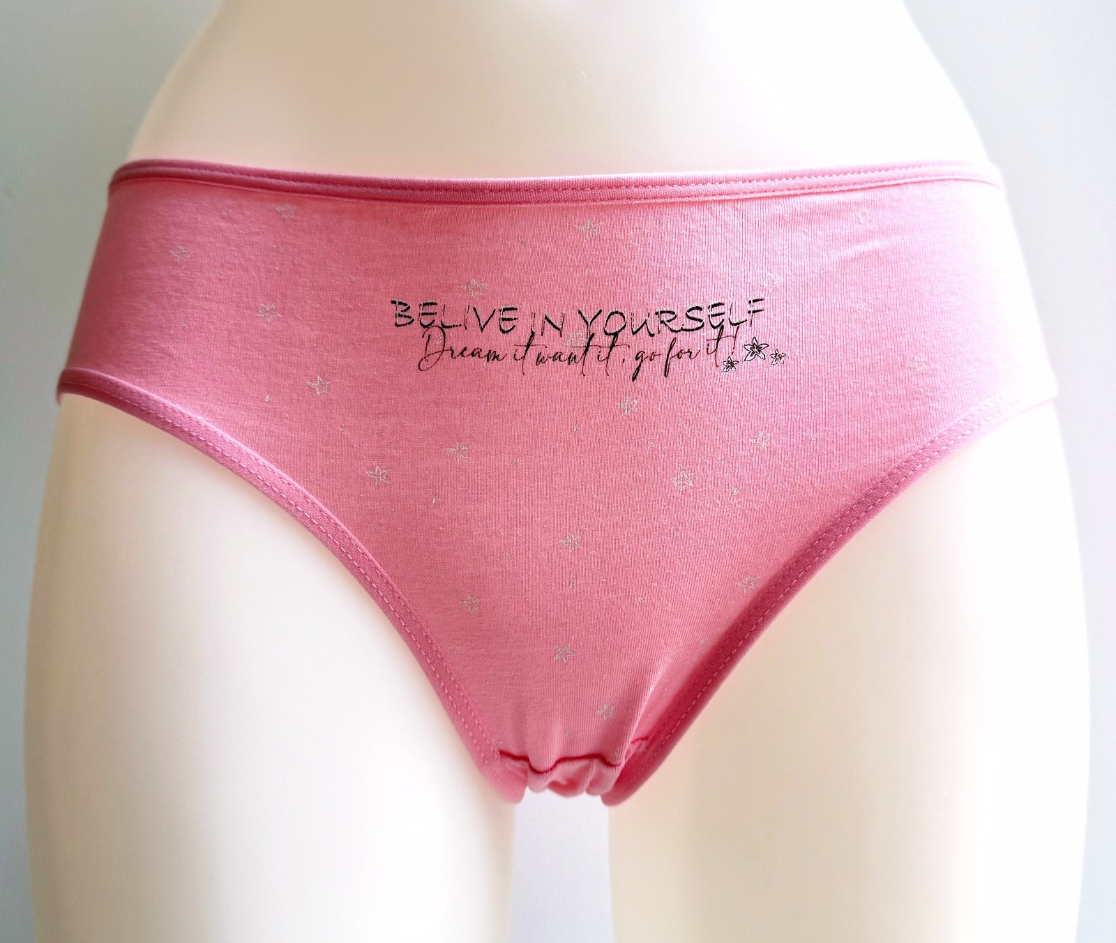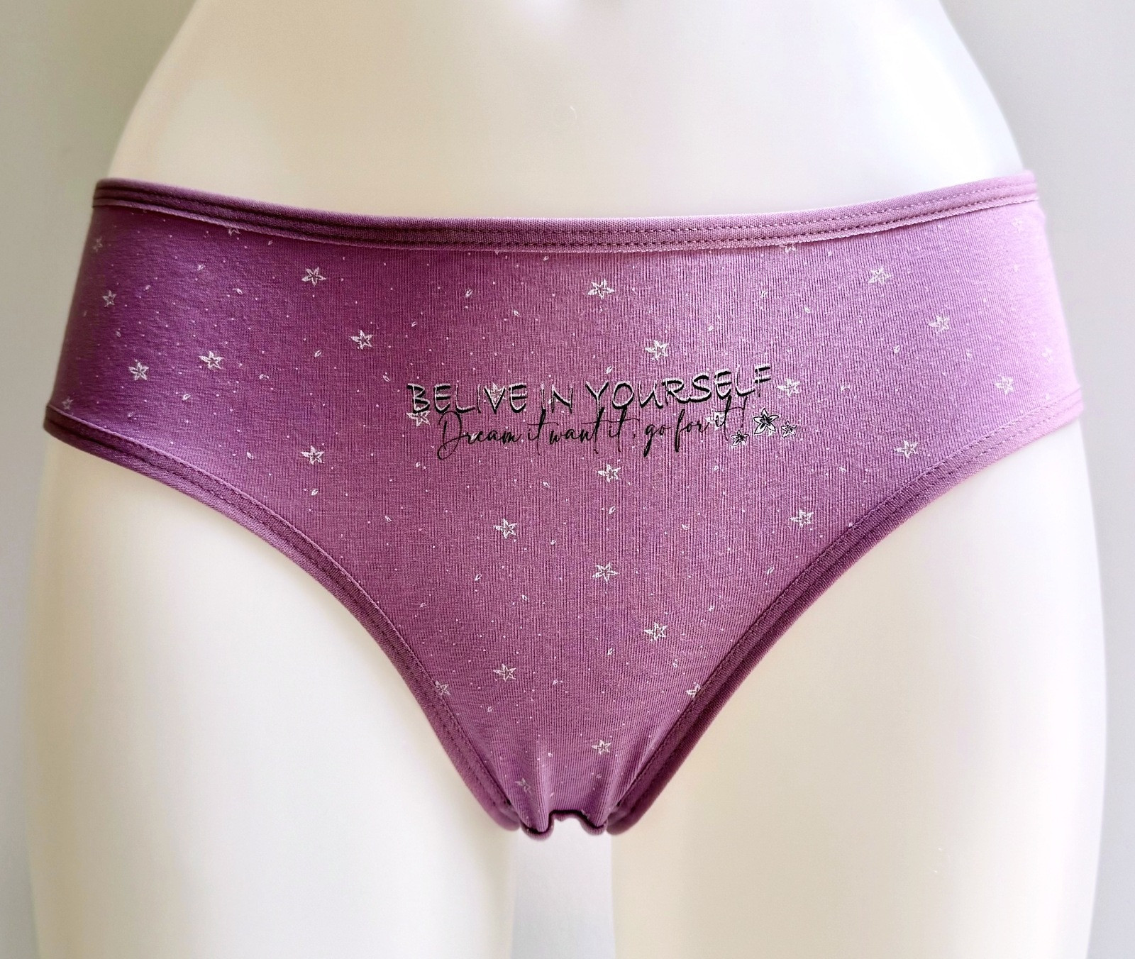 Dámské bavlněné kalhotky Bethany. Slušivé klasické kalhotky jsou pohodlným typem spodního prádla pro všechny příležitosti. Jsou zdobené drobnými hvězdičkami a nápisem. Obzvláště oceníte materiálové složení - 95% bavlna a 5% elasten. Použitý materiál je příjemný a poddajný na dotek.
