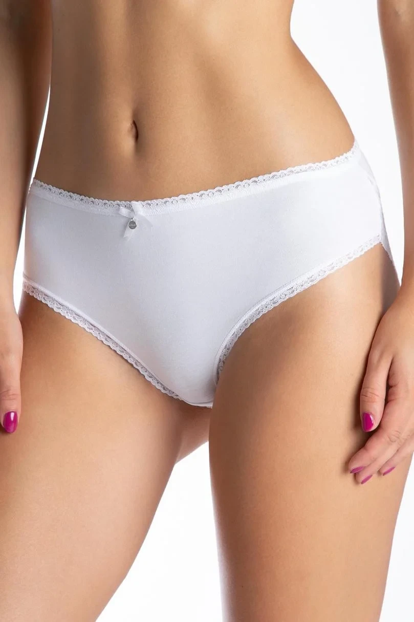 Nadčasový model dámských kalhotek s vysokým pasem a širšími boky. V balení dva kusy v bílé barvě s krajkovými prvky. V pase mají pohodlnou gumu a jsou velice pohodlné.