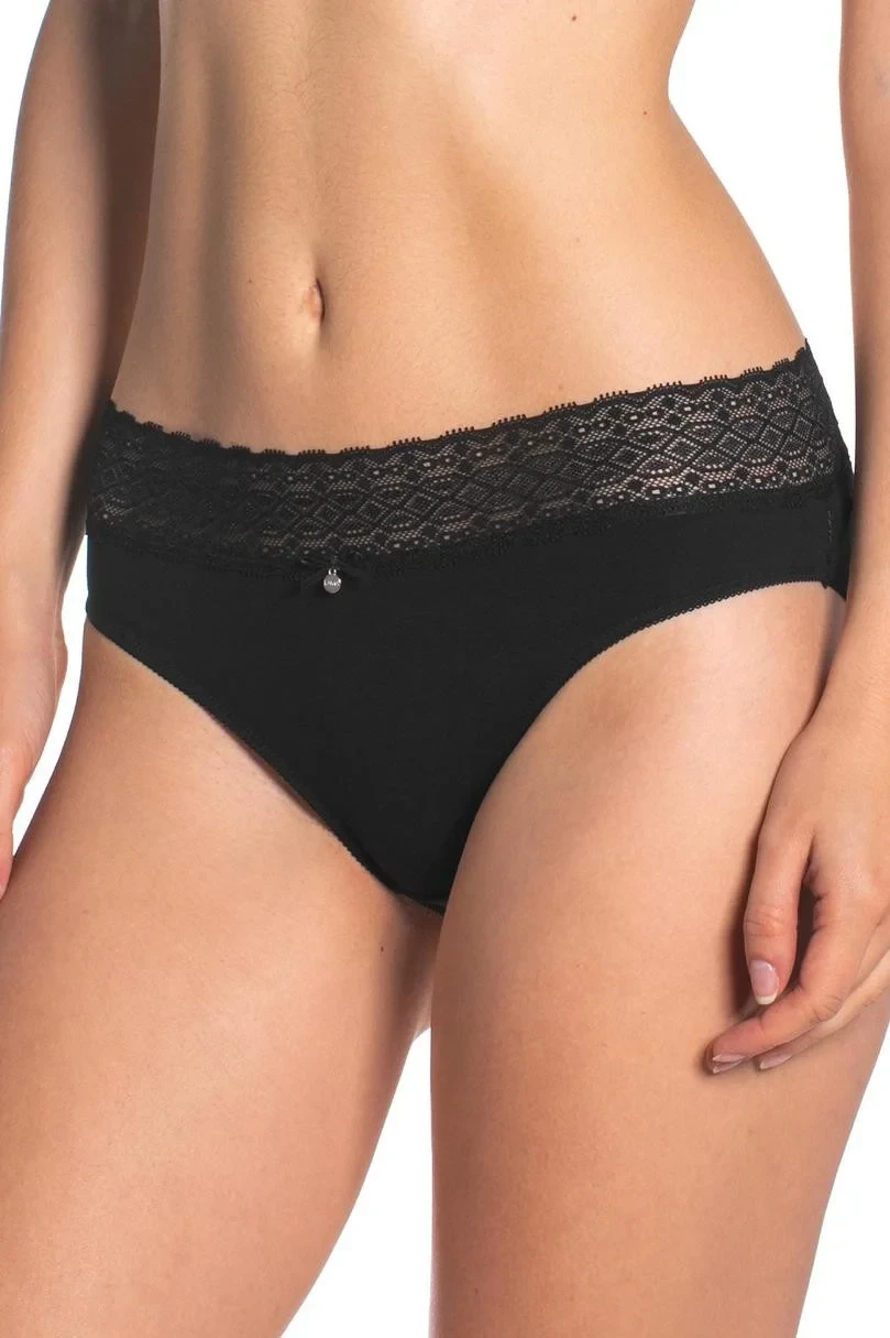 Kalhotky mají v pase pěknou širokou krajkovou gumu. Model spojuje ženský vzhled s elegancí a při nošení je pohodlný a komfortní. Kalhotky jsou balené po dvou kusech v černé barvě a mají v závislosti na modelu středně vysoký, nebo vysoký střih, širší boky a plnější zadní díl.