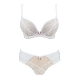 Zadní díl kalhotek je vyrobený z pružné síťoviny, je vysoko vykrojený a je lemovaný bezešvě. Přední díl modelu je ušitý z bílé krajky s květinovým motivem. Boky tvoří mikrovlákno a síťovina. V pase modelu je bílá lemovka a bižuterní ozdobou ve tvaru kolečka.