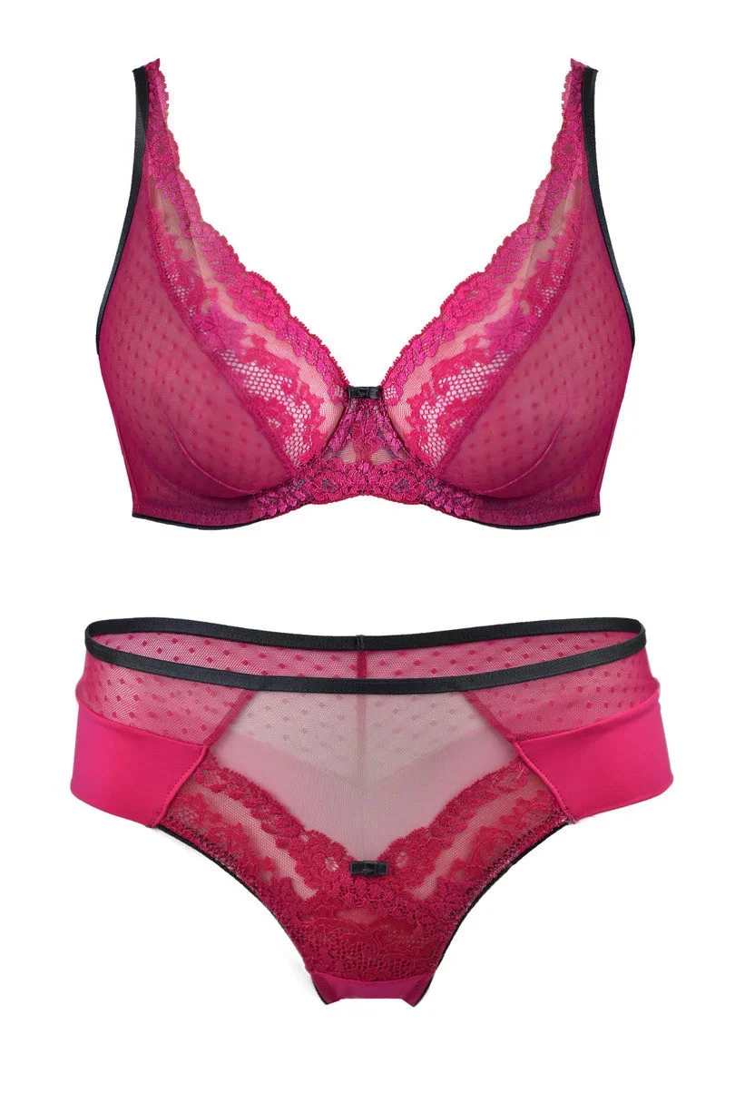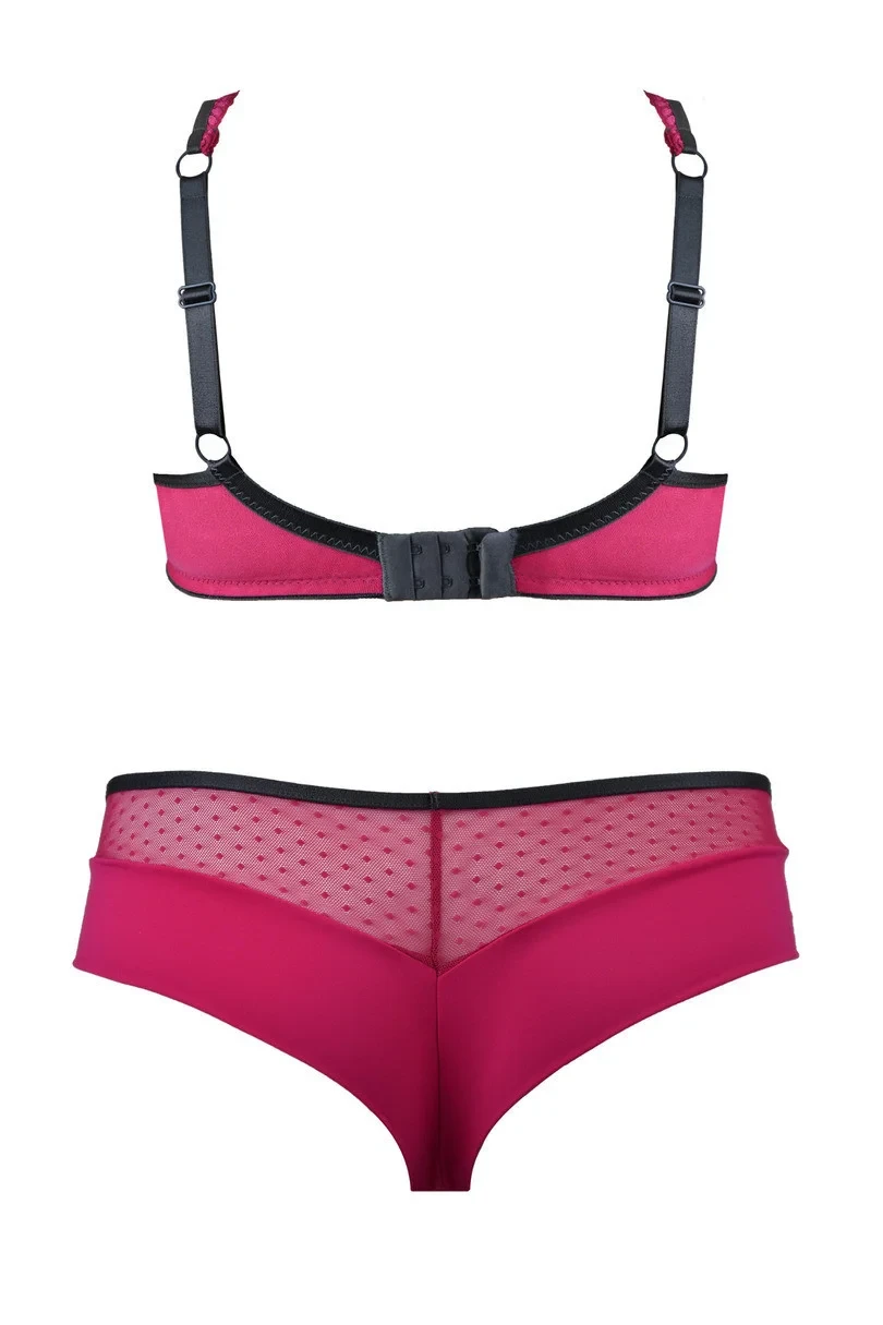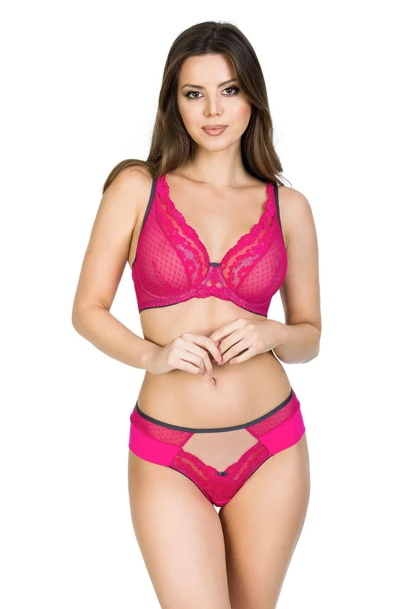 Zadní díl kalhotek je vyrobený z pružného mikrovlákna, je lemovaný bezešvým způsobem a je vysoko vykrojený. Přední díl modelu je ušitý z růžové krajky s květinovým motivem. Boky kalhotek tvoří mikrovlákno a síťovina. V pase modelu je lemovka v grafitové barvě s mašličkou v grafitové barvě.