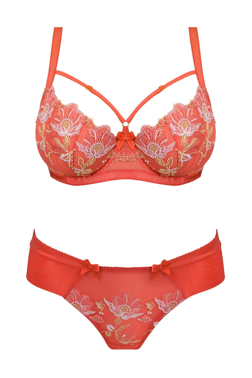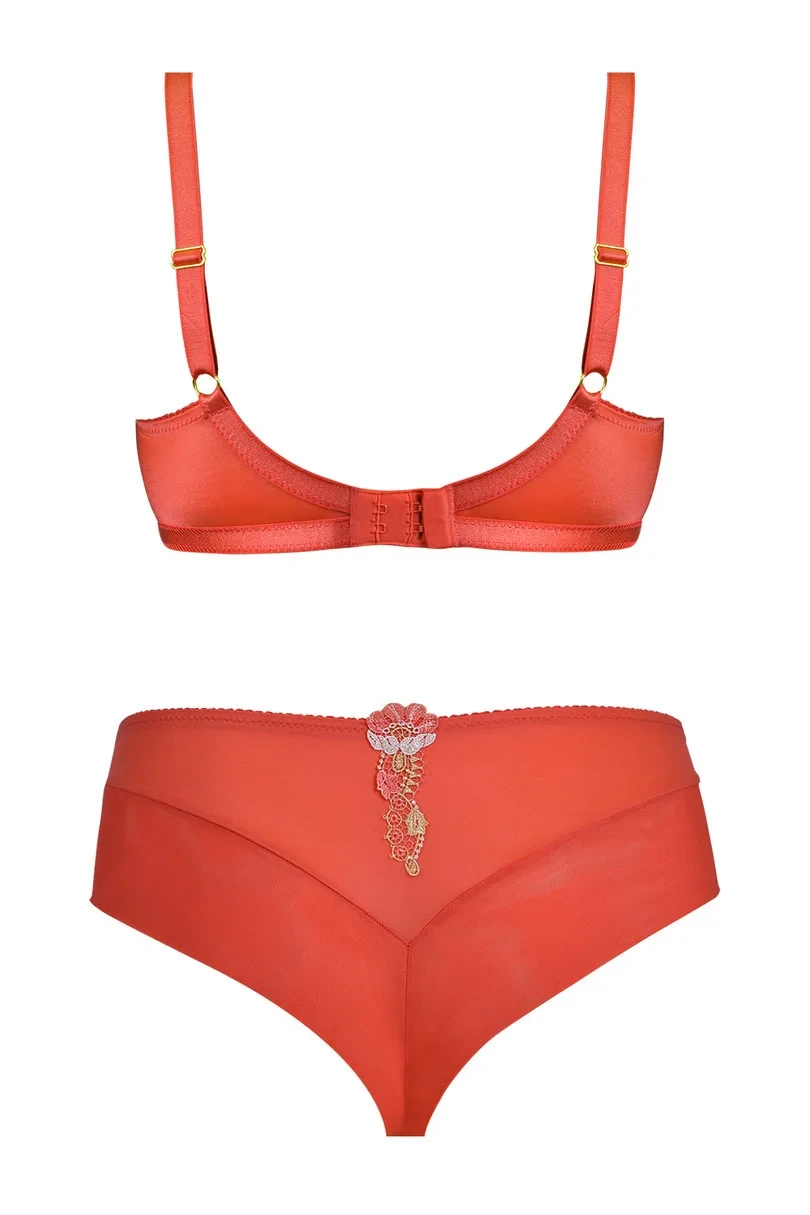 Zadní díl kalhotek je vyrobený z oranžového mikrovlákna a tylu ozdobeného květinovou aplikací. Zadní díl je vysoko vykrojený. Přední díl modelu tvoří výšivka s květinovým motivem. Boky jsou ušité z mikrovlákna a tylu. V pase jsou dvě ozdobné mašličky.
