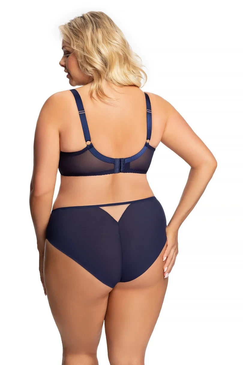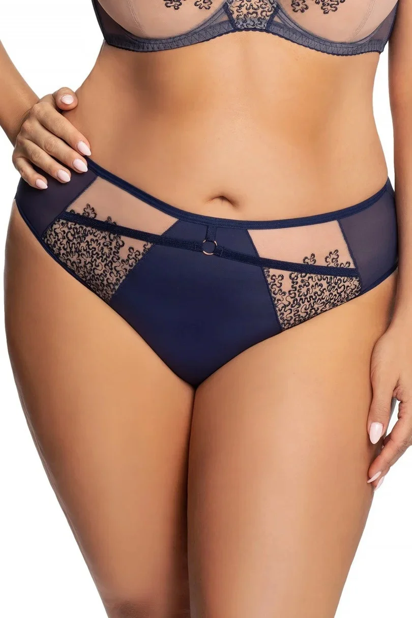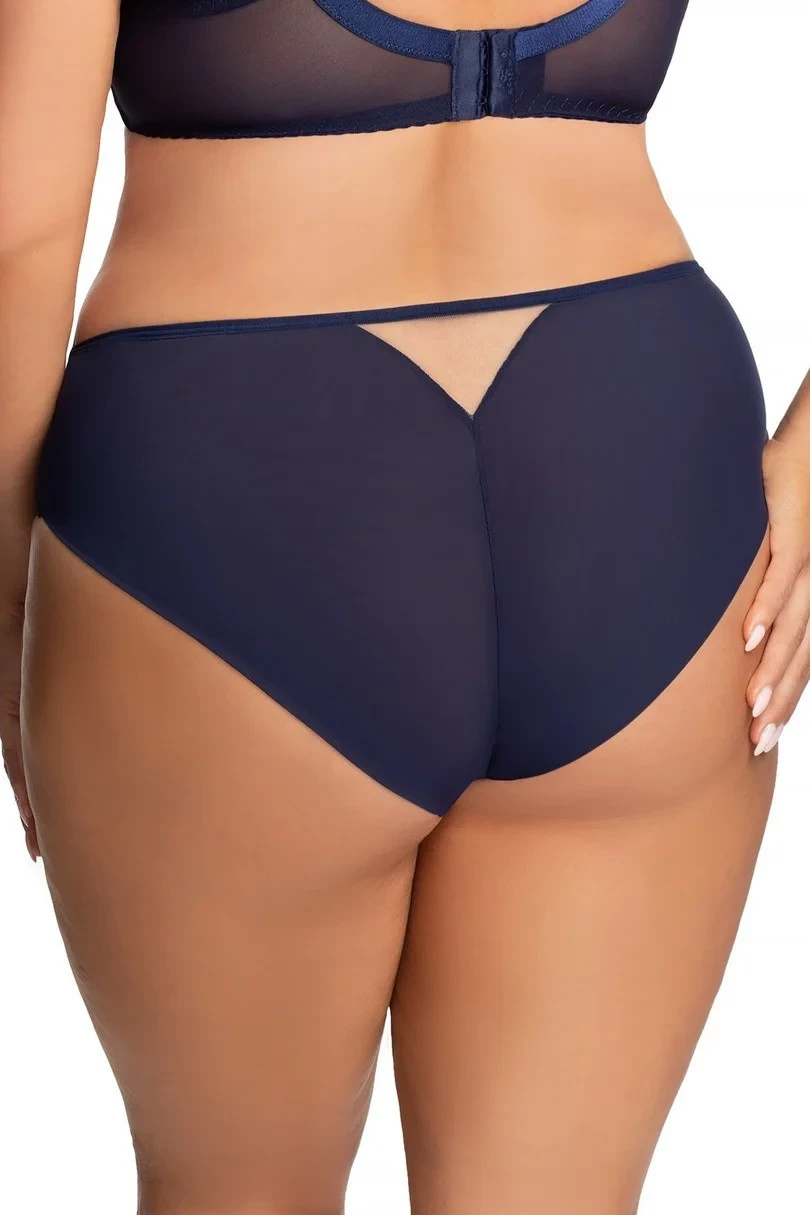 Přední díl kalhotek je ozdobený vsadkou z vyšívané síťoviny.