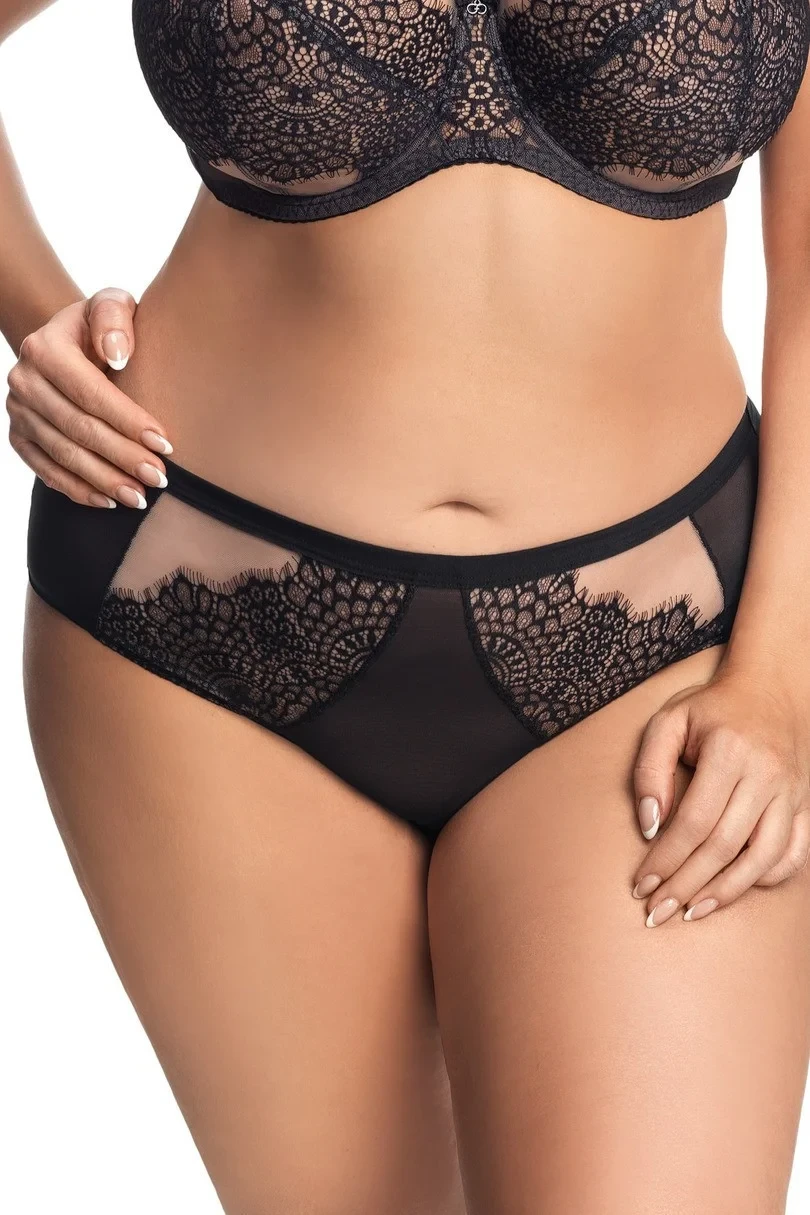 Přední díl kalhotek je vyrobený ze dvou vrstev tylu (béžového ve spodní části a černého ve vrchní části) a ze dvou vsadek z jemné vzorované krajky. Zadní díl modelu tvoří mikrovlákno a lehce průsvitný černý pružný tyl. Přední i zadní díl kalhotek jsou ve spodní části obšité tenkou pružnou páskou.