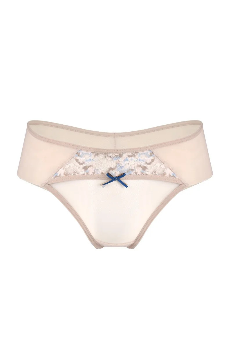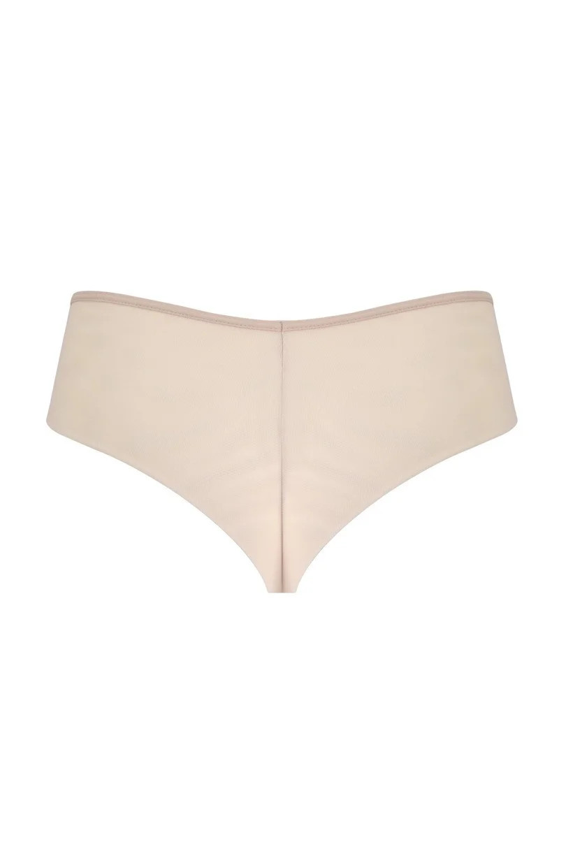 Přední díl kalhotek zdobí pěkná květovaná výšivka. Zadní díl modelu ze dvojitého tylu je vysoko vykrojený a má ploché lemování.
